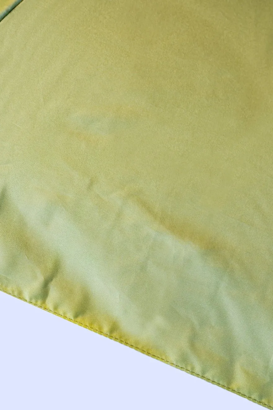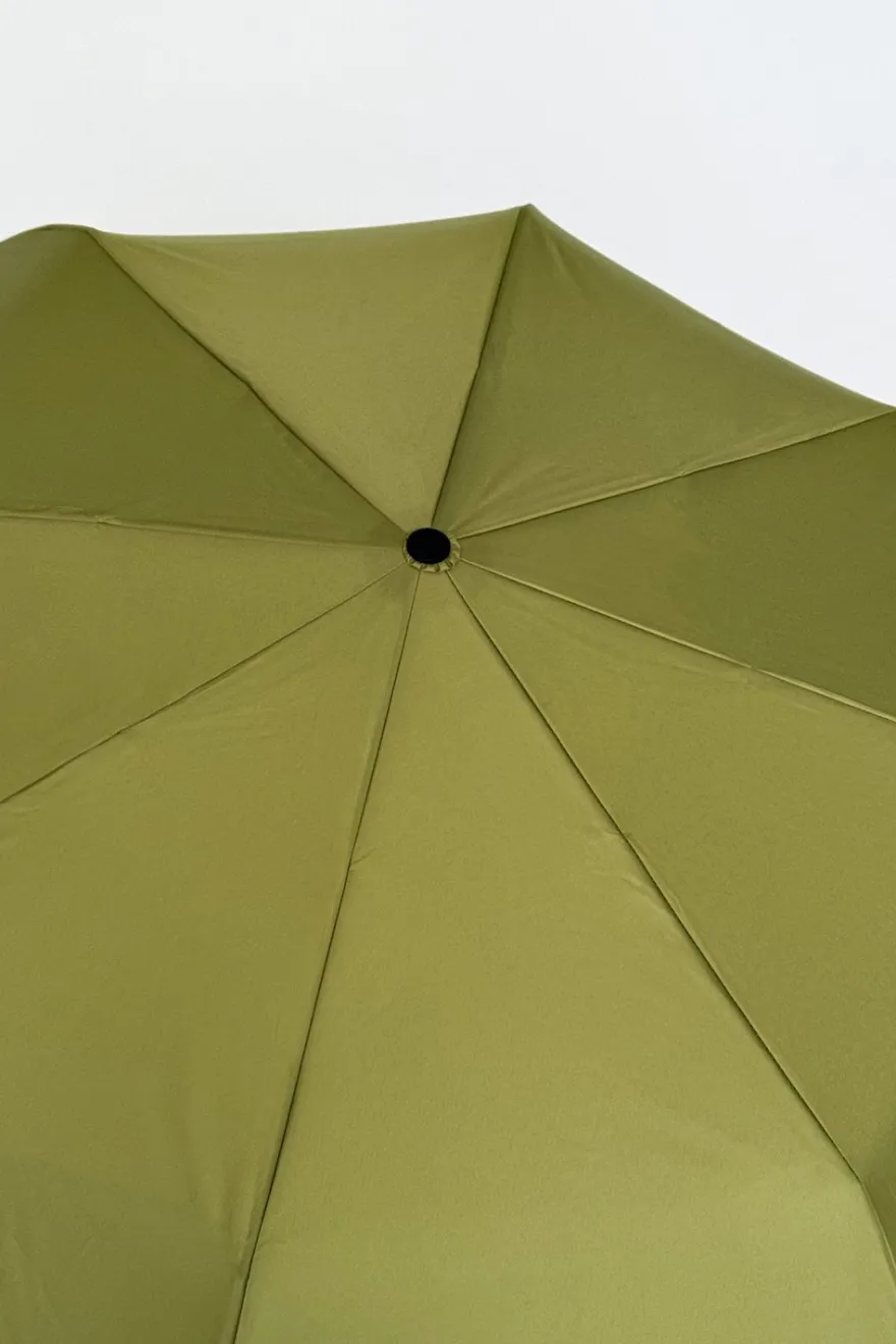 Paraguas con diseño verde oliva y mango con cabeza de pato hecho a mano a partir de nueve botellas de plástico, y diseñado en Londres.