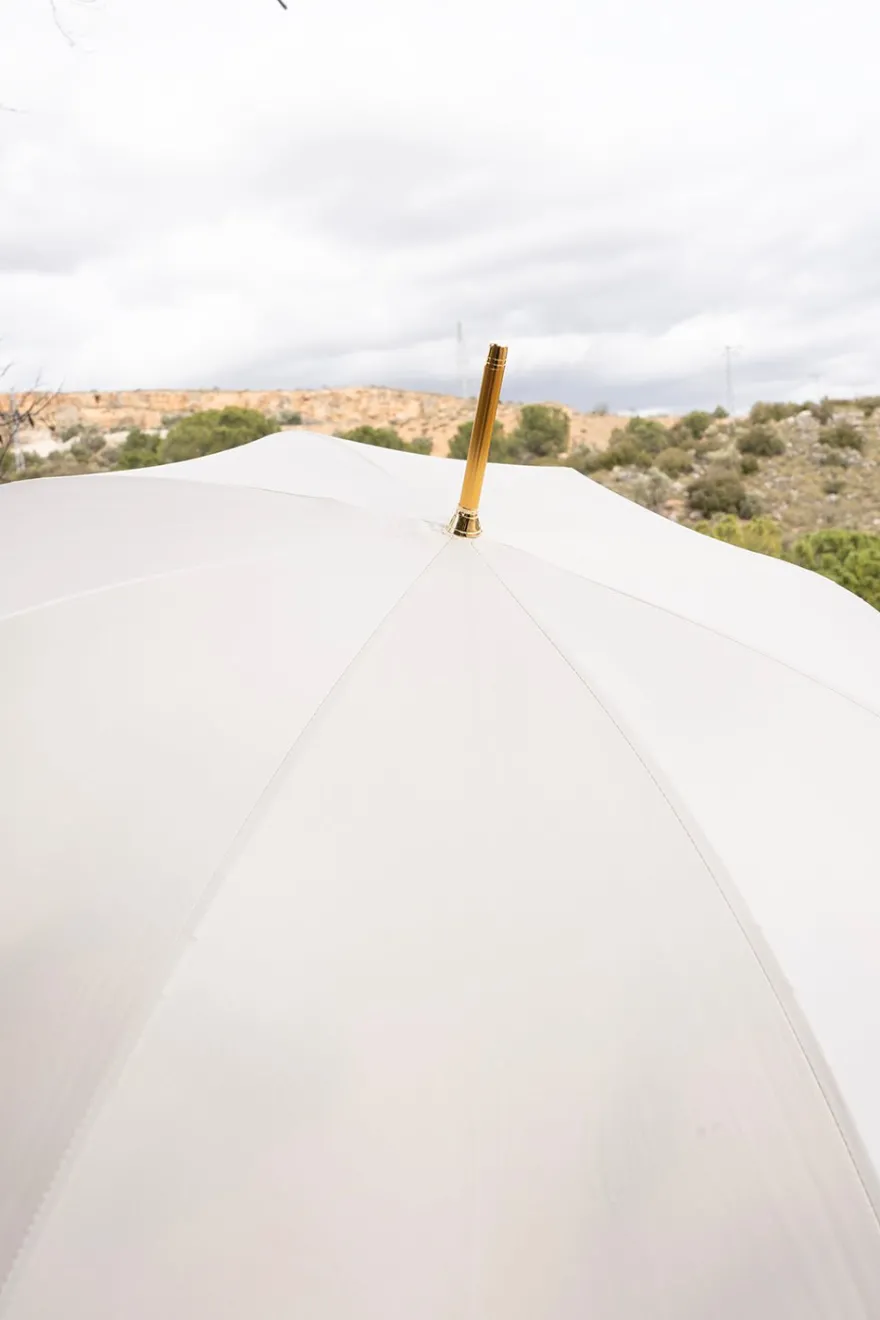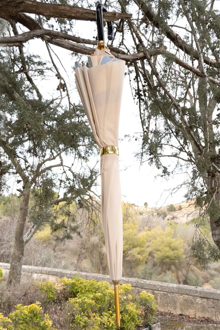 Paraguas de la marca «Pasotti» fabricado en Italia con apertura manual de 100% poliéster y mango en acetato, con diseño beige e interior de diferentes colores.
