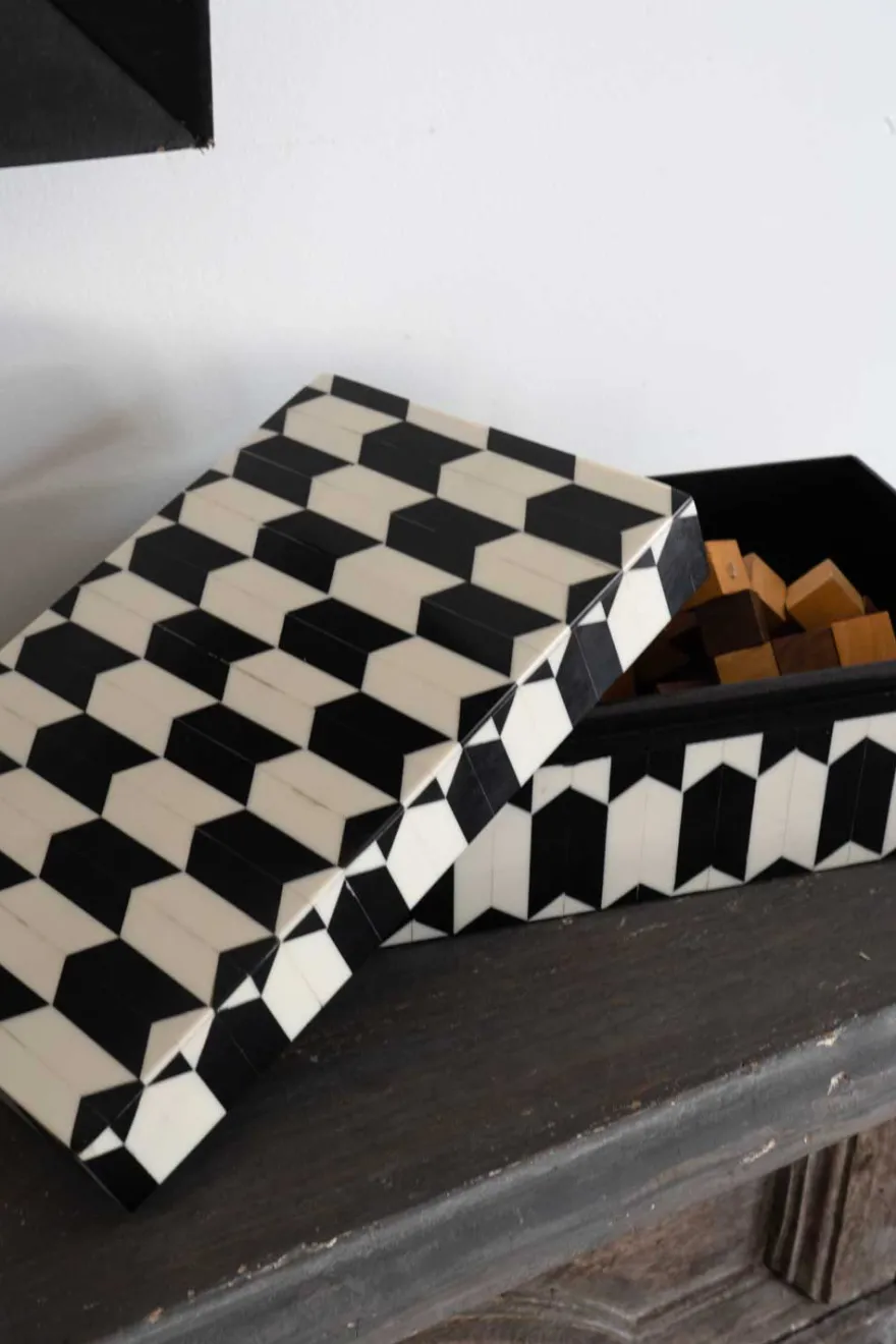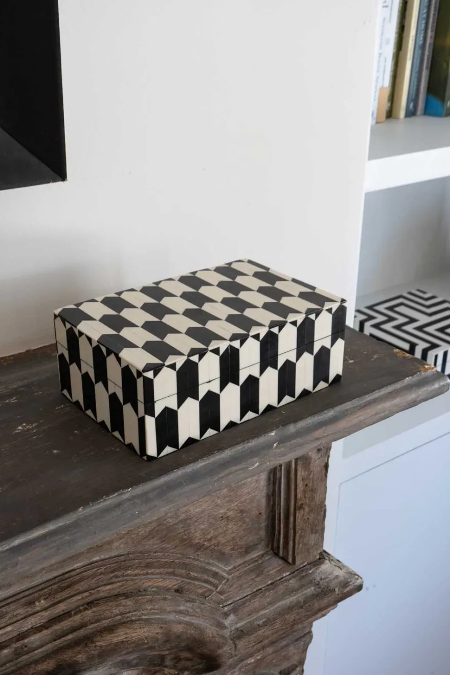 Caja decorativa de resina con diseño de flechas blancas y negras. Elaborada con patrones únicos y fabricada de manera artesanal. Estas piezas están diseñadas y pulidas de tal forma que su acabado permanece como el primer día durante mucho tiempo.
