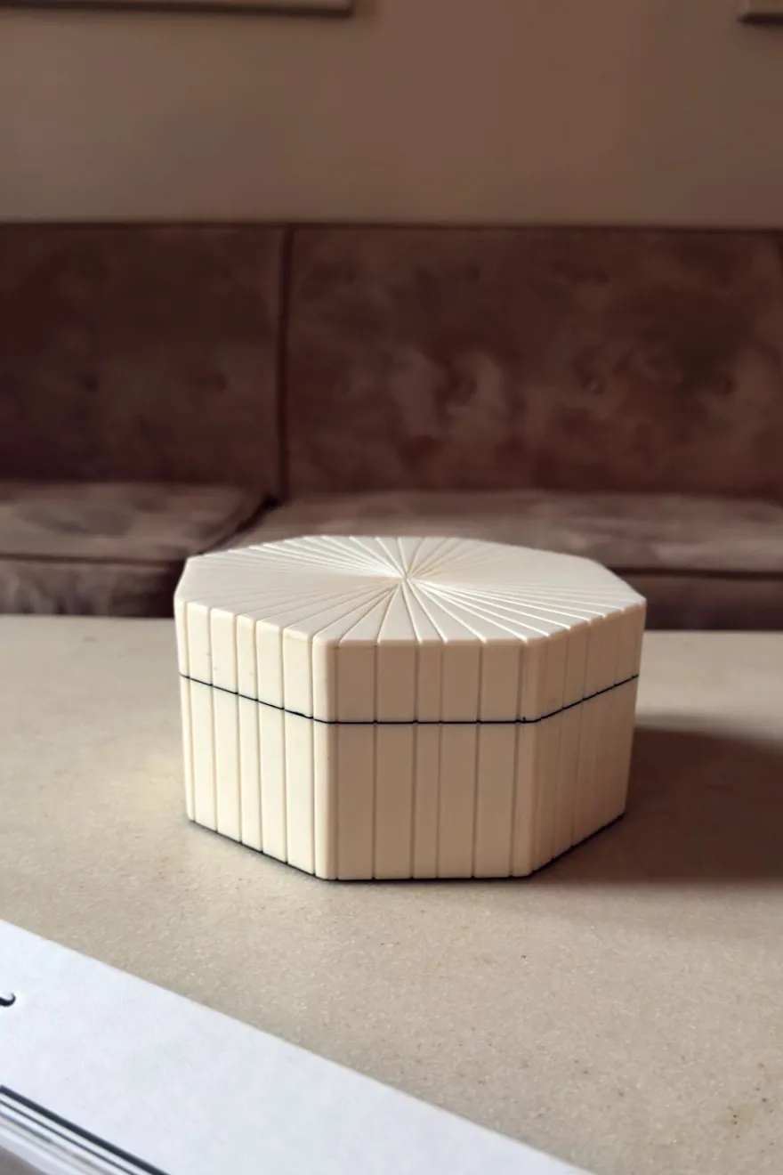 Caja decorativa elaborada en resina blanca, con un elegante diseño hexagonal que aporta un estilo moderno y distintivo. Fabricada de manera artesanal, cada pieza presenta patrones y acabados únicos.