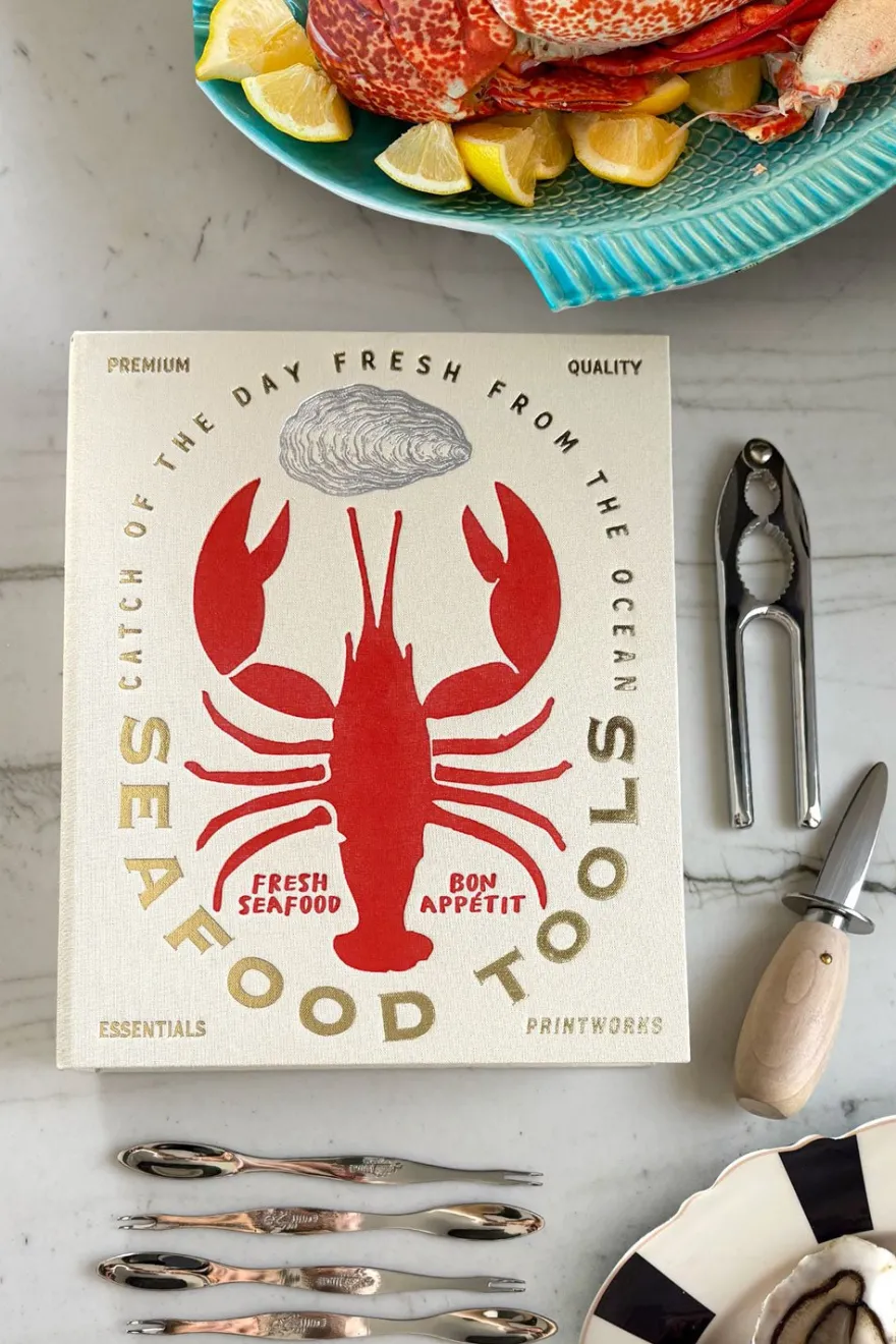Kit para Mariscos, presentado en una elegante caja tipo libro. Al abrirla, descubrirás tres herramientas esenciales para disfrutar de los mariscos como un experto. Este set es práctico, sofisticado y perfecto para regalar o disfrutar en casa