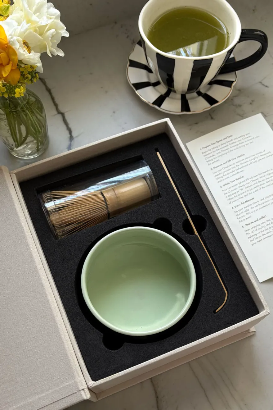 Set de té matcha, presentado en una elegante caja con forma de libro. Al abrirla, descubrirás las tres herramientas esenciales para prepararlo. Cada elemento está pensado para disfrutar de este ritual japonés de una manera única.