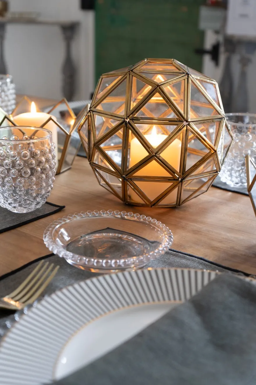 Elegante pieza decorativa de cristal con diseño en forma de esfera y detalles dorados, que la otorgan un toque de lujo y distinción. Perfecta tanto para iluminar, como para servir como un elemento decorativo único en cualquier espacio.