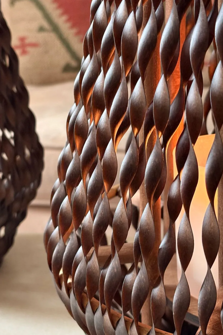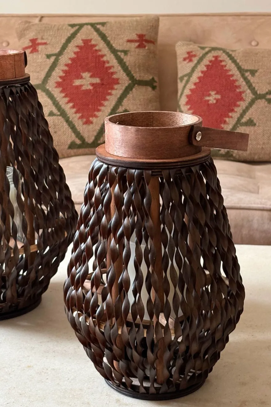 Farolillo decorativo elaborado en madera y cuero trenzado, una combinación de materiales naturales que aporta calidez y un estilo artesanal a cualquier ambiente. Su diseño de entramado permite que la luz se filtre suavemente, creando un efecto acogedor y decorativo.