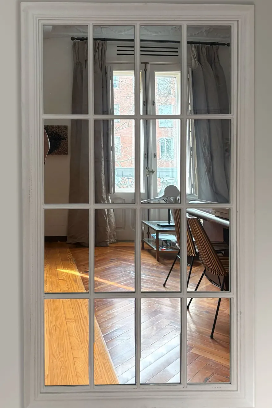 Espejo decorativo de cristal con diseño inspirado en una ventana, que aporta luminosidad y sensación de amplitud a cualquier espacio. Su estructura dividida en múltiples paneles crea un elegante efecto visual que recuerda a los ventanales tradicionales, combinando estilo clásico con un toque contemporáneo.