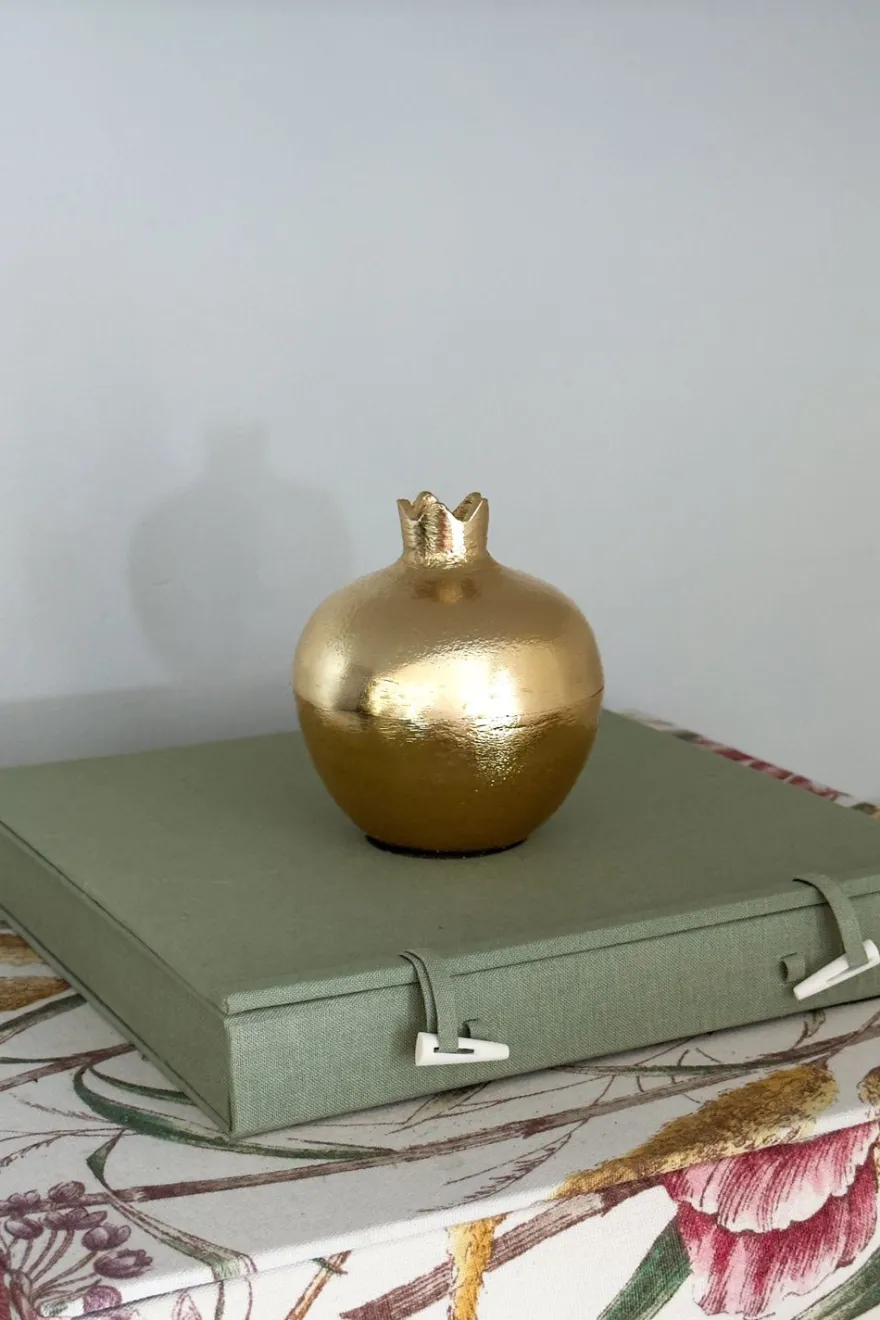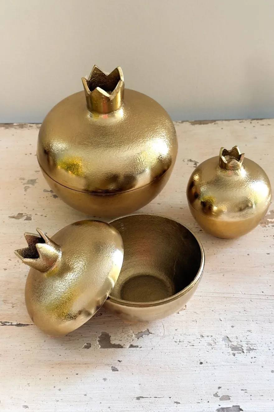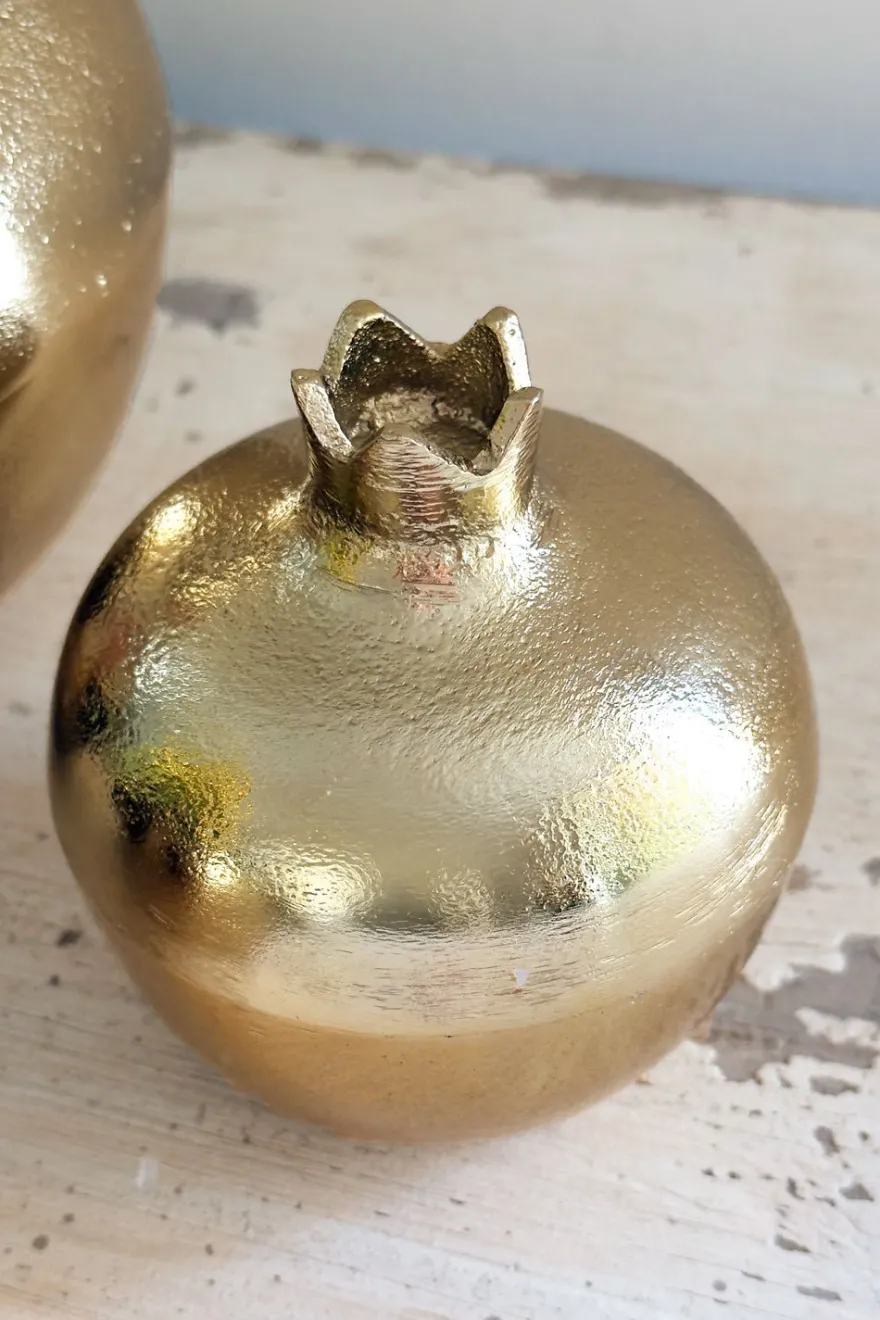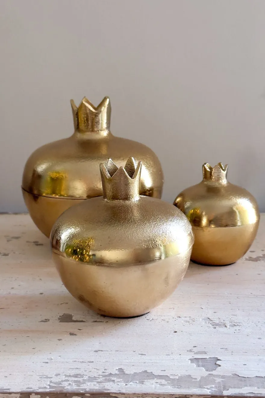 Granadas en elegante acabado dorado de bronce, diseñadas para decorar con estilo. Su tapa desmontable permite guardar objetos pequeños o utilizarse como recipiente para servir aperitivos, combinando funcionalidad y estética en un solo detalle. Disponibles en tres tamaños para adaptarse a cualquier espacio.