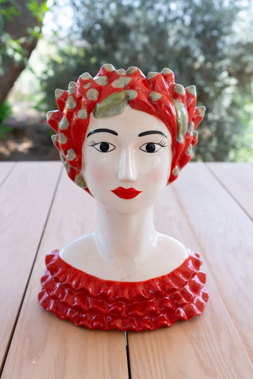 Jarrón de porcelana italiana con diseño de busto de mujer y chilis, pintado a mano, ideal para darle un toque artesanal a la decoración de tu hogar.