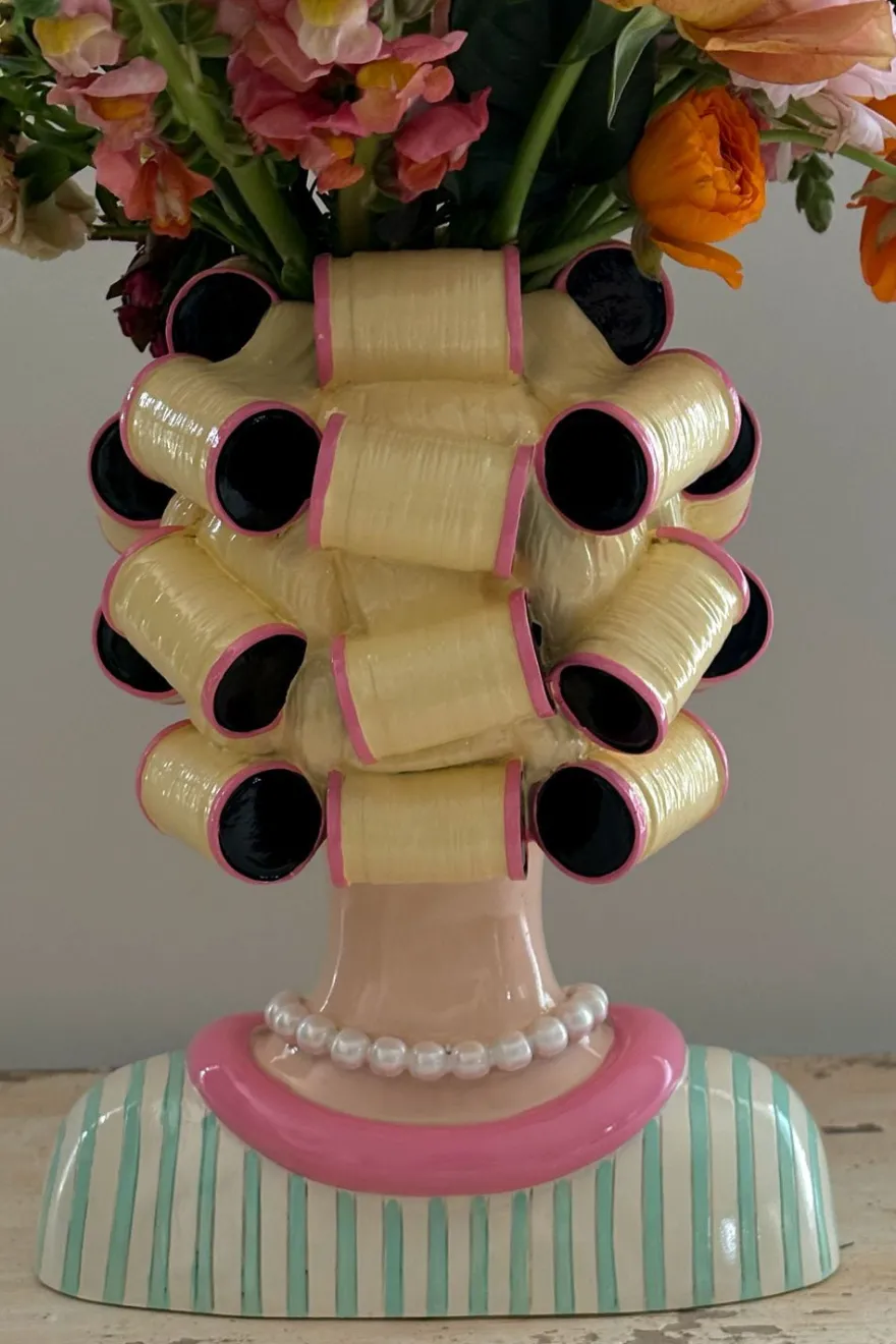 Jarrón de porcelana «Lady Rulos» para darle un toque de humor y personalidad a cualquier espacio. Se trata de una pieza única que combina arte, diseño y una buena dosis de actitud. Con forma de cabeza de mujer en pleno día de spa, lleva rulos y pepinos en los ojos, lista para relajarse y robar todas las miradas.