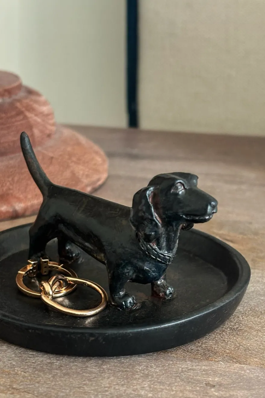 Este elegante platito de metal presenta una encantadora figurita de un teckel en el centro, creando un diseño único que combina funcionalidad y estilo. Perfecto para usar como vaciabolsillos, joyero o para guardar pequeños objetos. Ya sea en la mesa de entrada, en una mesita de noche o sobre tu escritorio.
