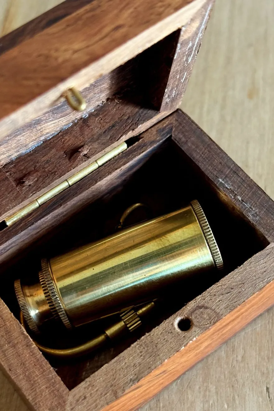 Original llavero inspirado en los clásicos catalejos de navegación, con acabado en tono latón que le aporta un elegante estilo náutico y vintage.