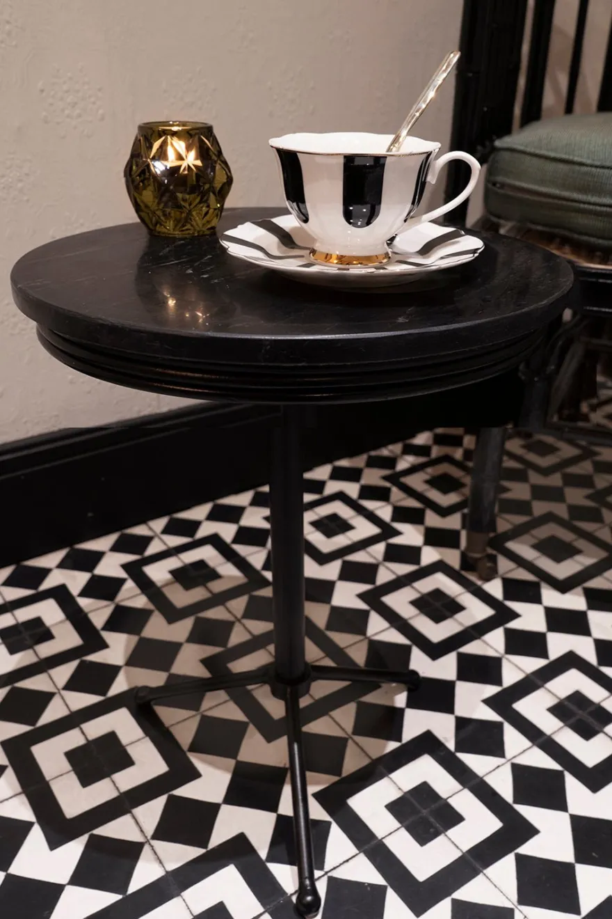 Mesa redonda negra de mármol y hierro, perfecta para complementar la decoración de tu salón o de cualquier espacio de tu casa, o incluso podría usarse como mesilla de noche.