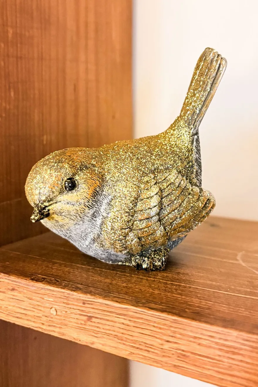 Figura decorativa de un pájaro realizada en resina con un elegante acabado dorado brillante. Su diseño delicado añade un toque de estilo y sofisticación a la decoración de tu casa. Ideal para colocar en repisas, vitrinas o centros decorativos, aportando luz y distinción en cualquier ambiente.