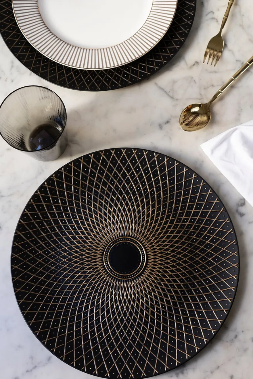 Bajoplato con fondo negro y diseño geométrico en color dorado, original y elegante para combinar tus mesas en cualquier ocasión especial.