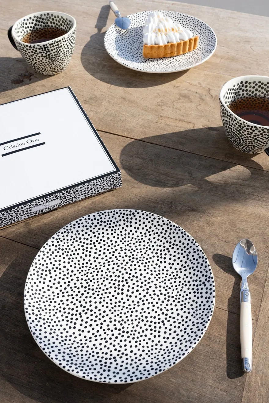 Plato de New Bone China en color blanco con puntos en color negro, su diseño es ligeramente irregular con estilo artesanal.