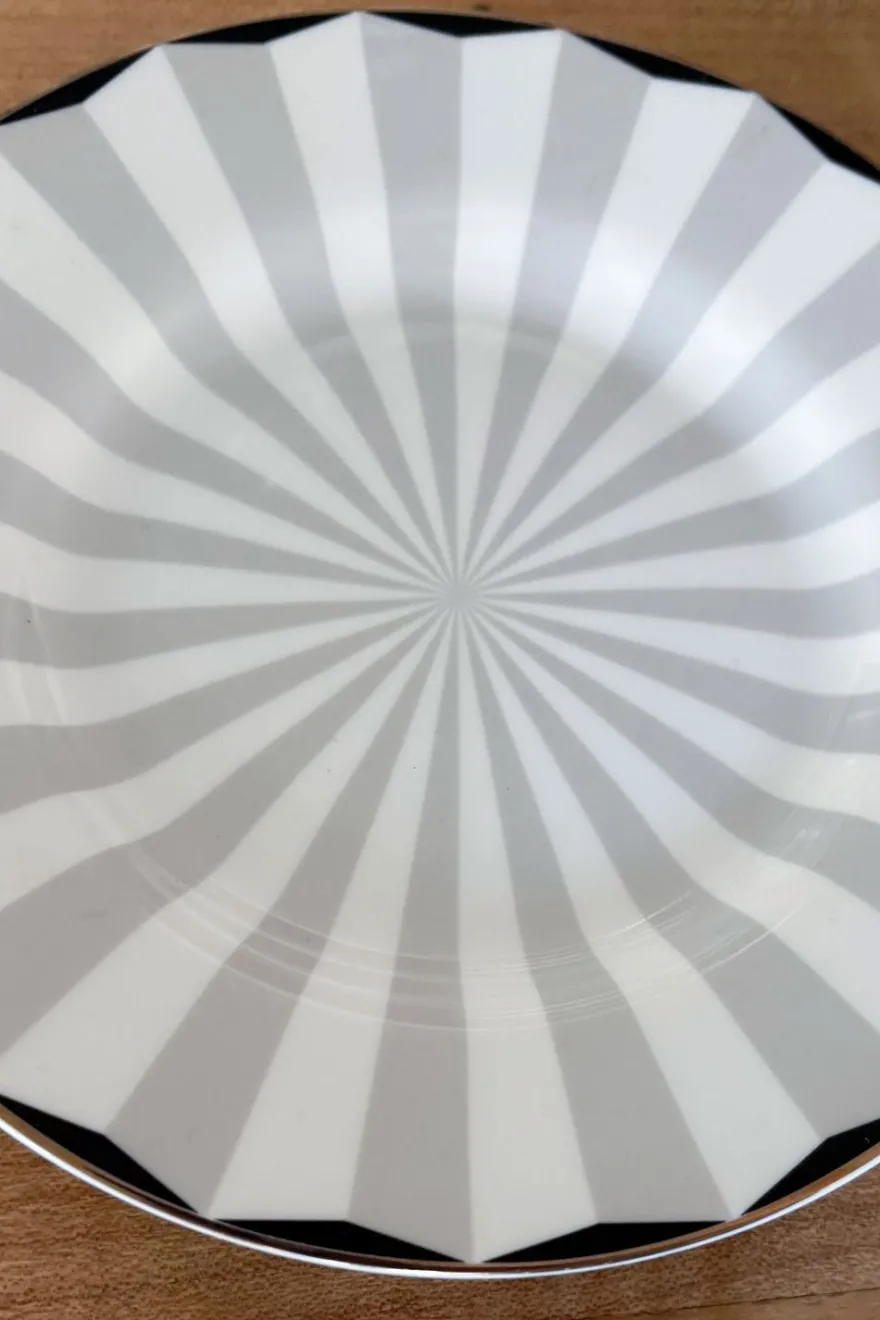 Plato de pan con diseño propio y un patrón radial en tonos grises que crea un efecto visual sutil y sofisticado. Su borde con delicados pliegues aporta textura y un acabado refinado. Perfecto para servir pan o aperitivos, realzando la presentación en la mesa con discreción y buen gusto.