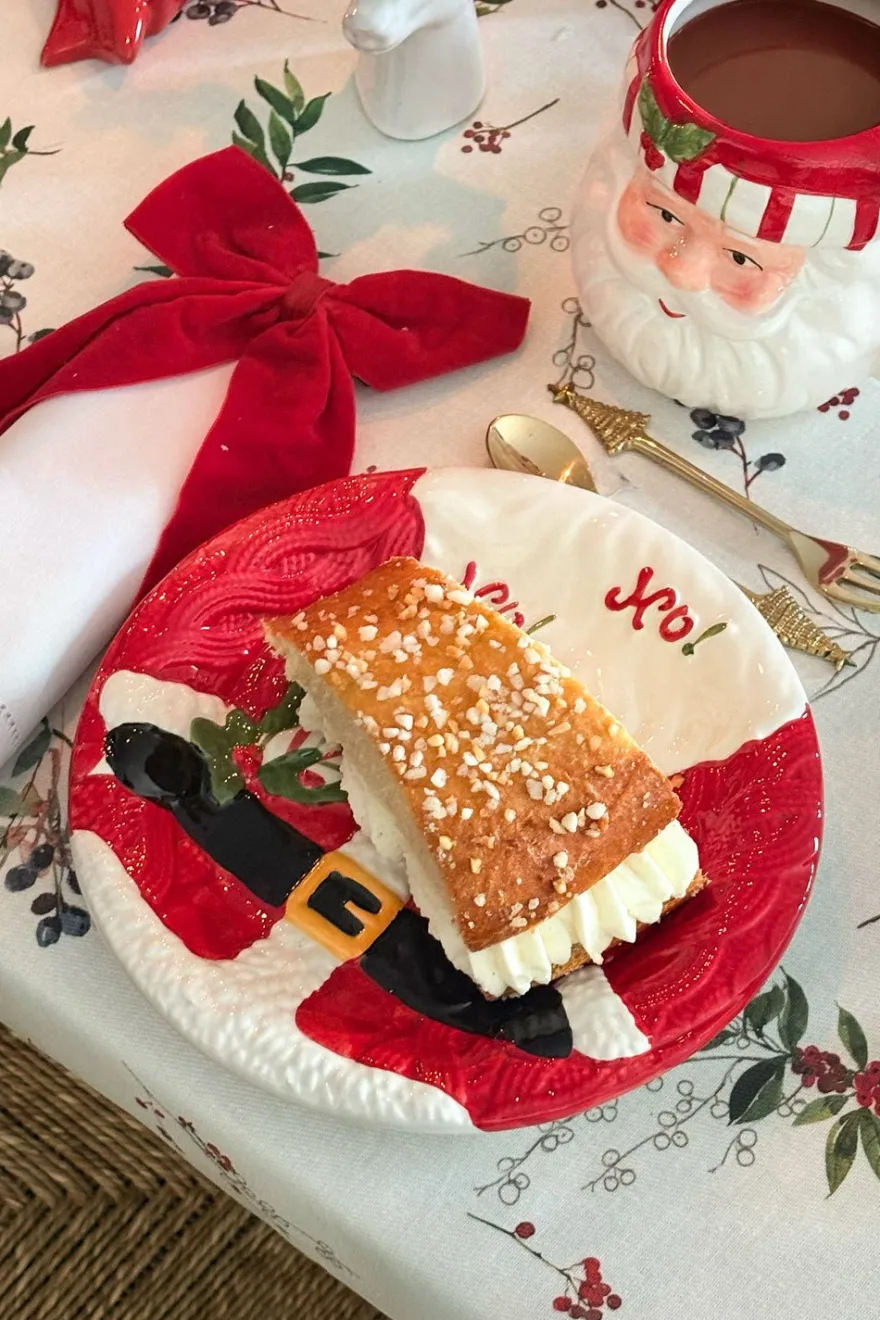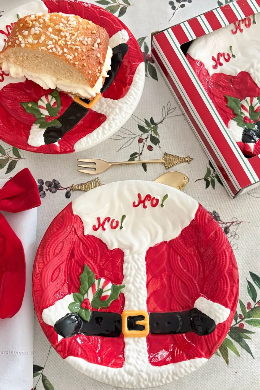 Plato de postre de nuestra vajilla de dolomita con alegres diseños de Papá Noel.
