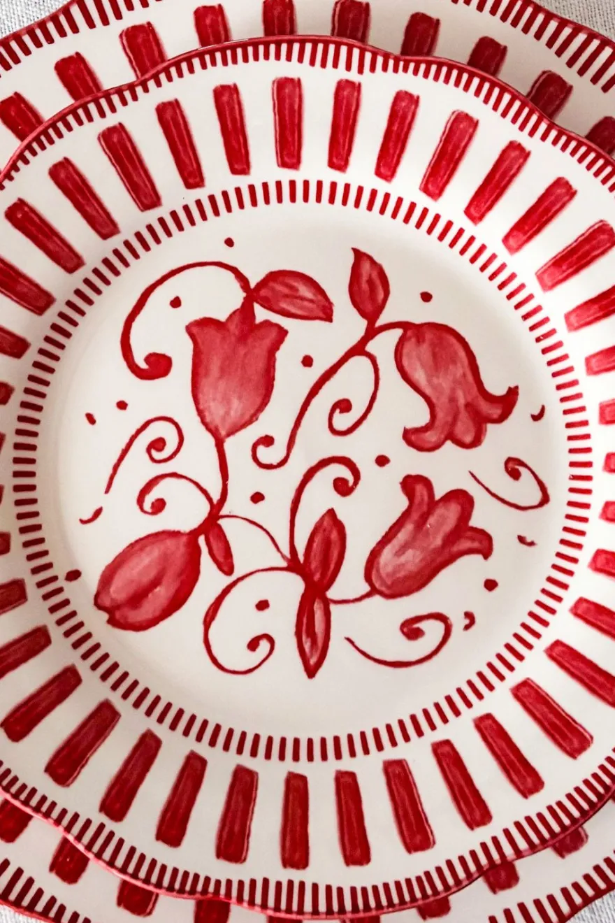 Plato de postre de nuestra vajilla de cerámica que combina la pureza del blanco con un alegre diseño en tonos rojos que aporta un estilo festivo y lleno de encanto. Cada pieza presenta un borde decorado con motivos geométricos y florales que realzan su carácter artesanal y su estética tradicional. Perfecta para usar tanto en el día a día como en ocasiones especiales. Resistente, decorativa y con un diseño que ilumina cualquier mesa, esta vajilla es ideal para quienes buscan añadir calidez, color y personalidad a sus comidas.