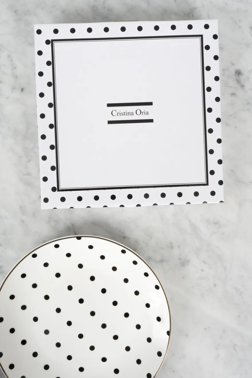 Plato de postre negro y blanco con diseño de puntos y delicado filo dorado decorando.