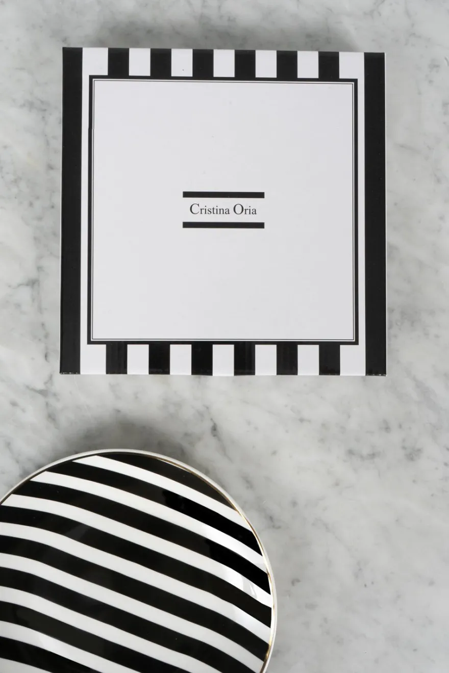 Plato de postre negro y blanco con diseño de rayas y delicado filo dorado decorando.