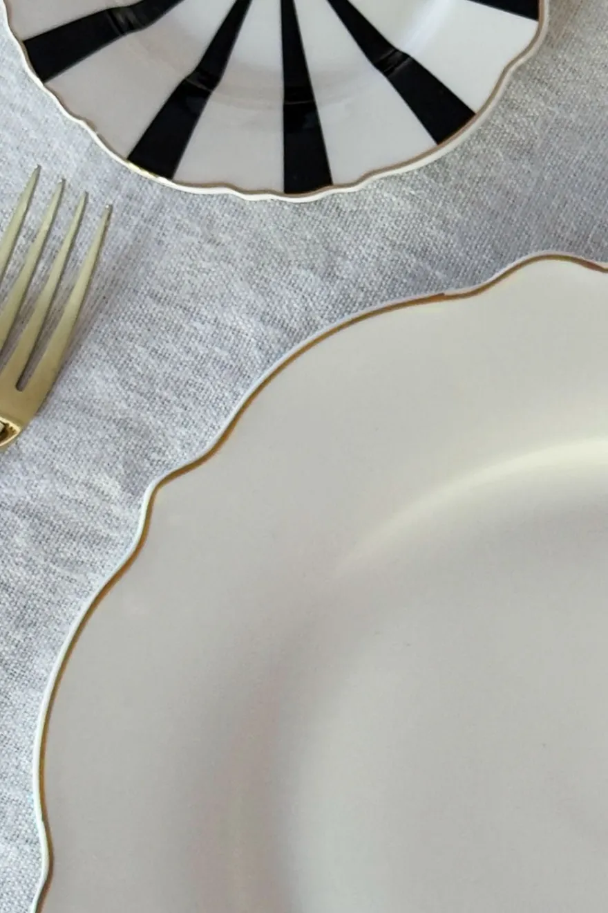 Plato llano de new bone en color blanco con delicado filo dorado que añade un toque de lujo a cualquier mesa.