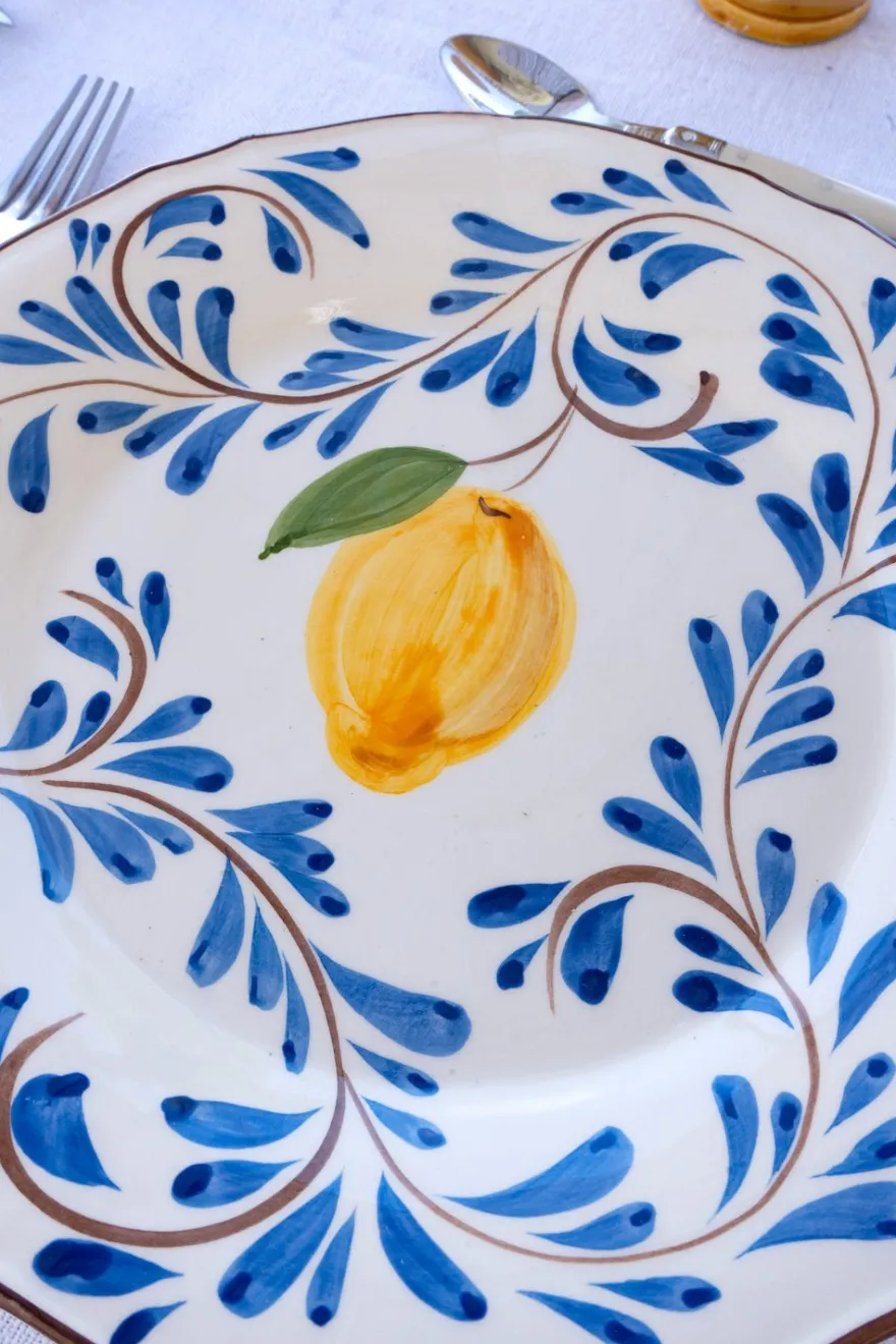 Plato llano de cerámica artesanal pintado a mano con diseño de limones sobre fondo blanco y detalles azules.