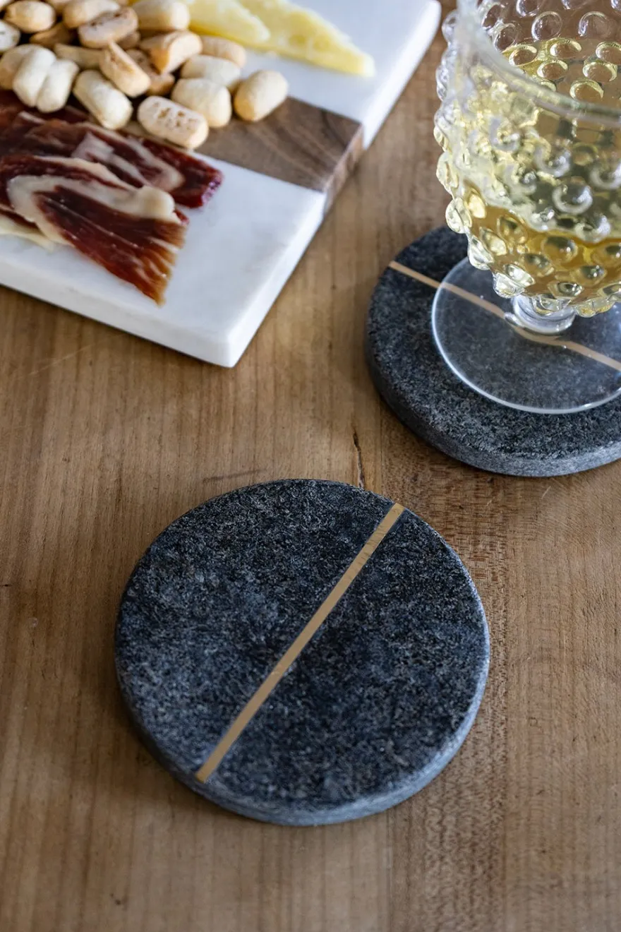 Posavasos de mármol con diseño redondo en color negro grisáceo con filo dorado, súper original y elegante para colocar las copas y vasos evitando que dejen huella en la mesa.