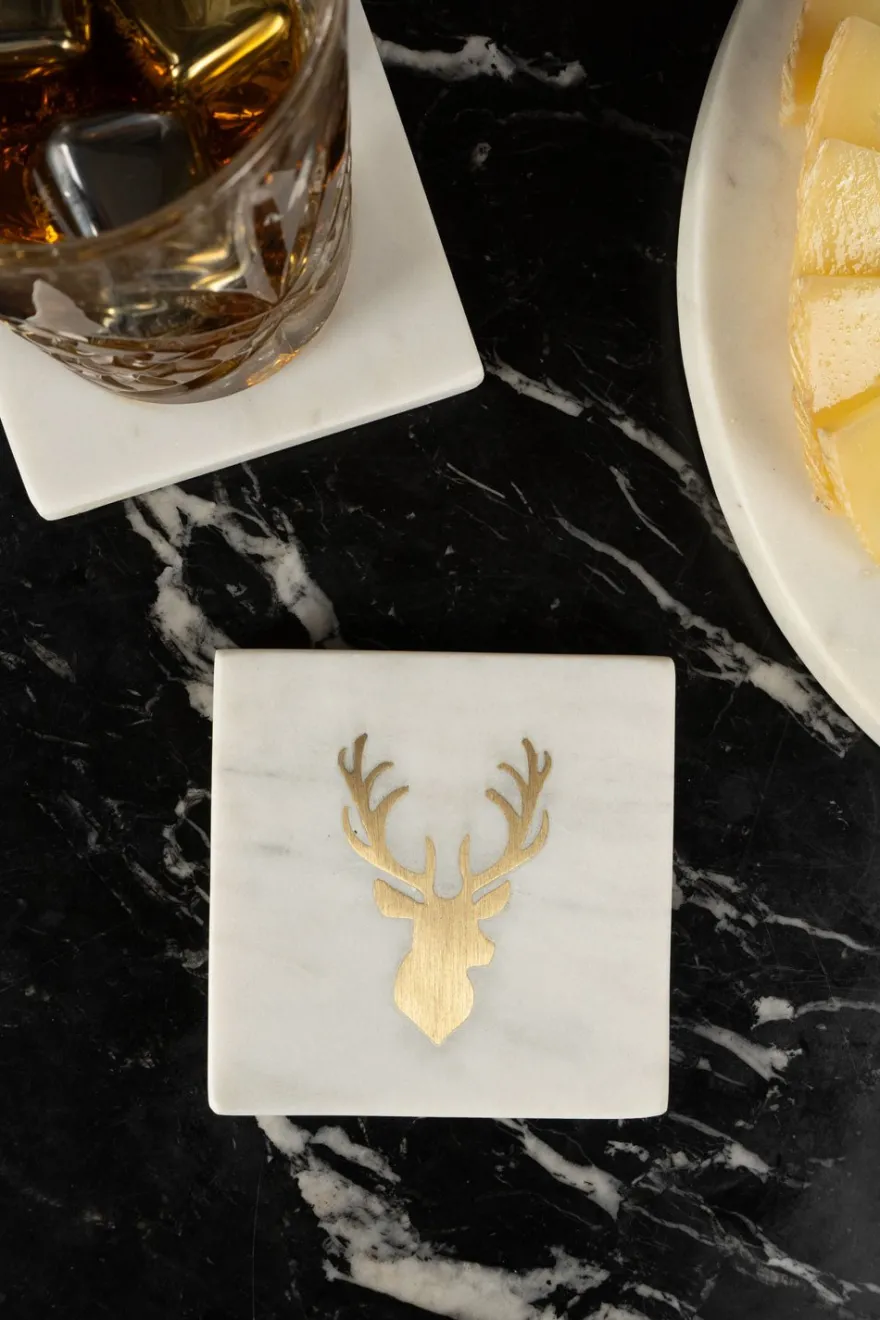 Posavasos cuadrado de mármol con ciervo de latón en color dorado, ideal para complementar tus mesas en Navidades o en cualquier época del año. También es perfecto para las casas de campo.