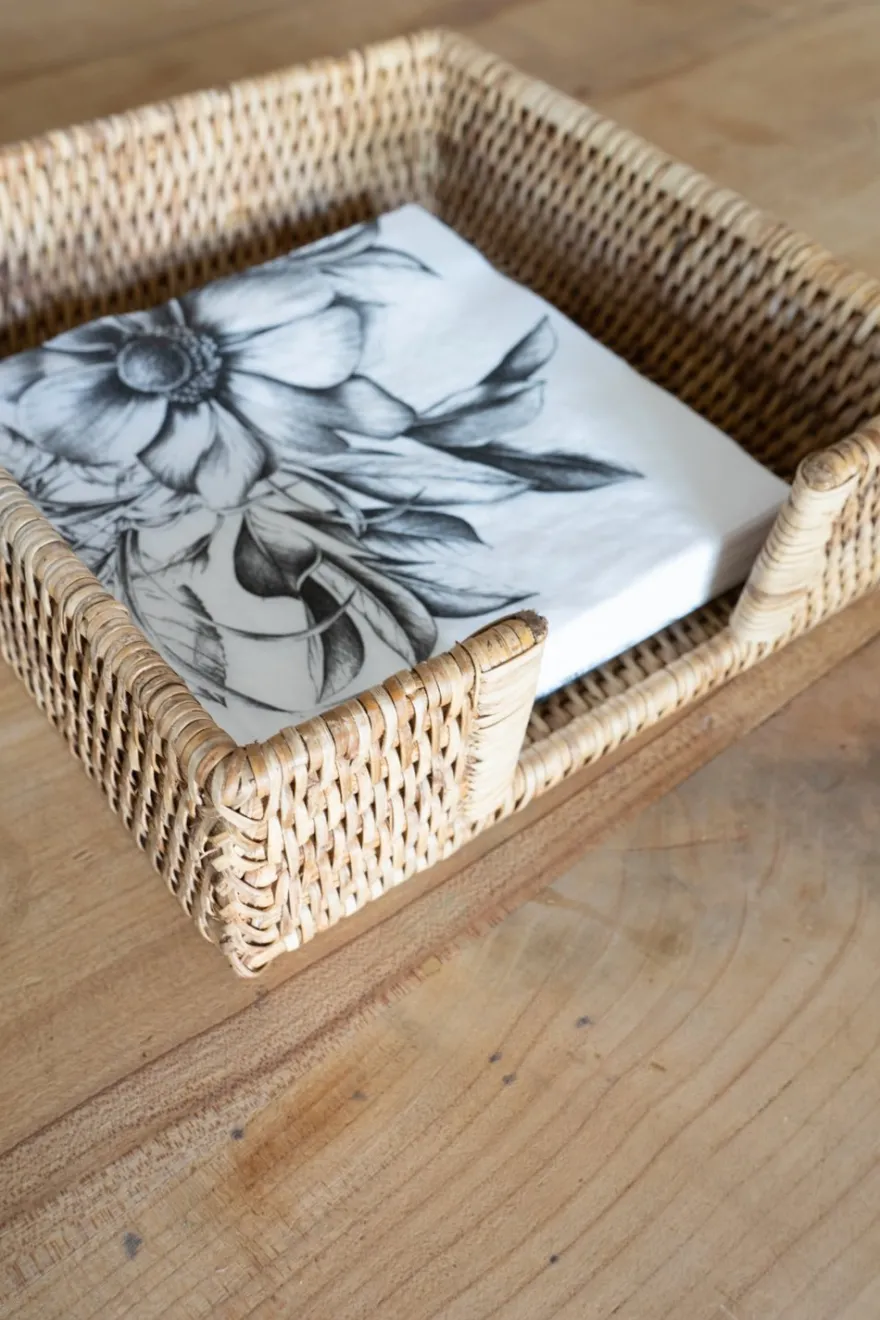Servilletero cuadrado de ratán en color marrón natural, ideal para complementar tus mesas tanto en interiores como en exteriores, o en el campo.