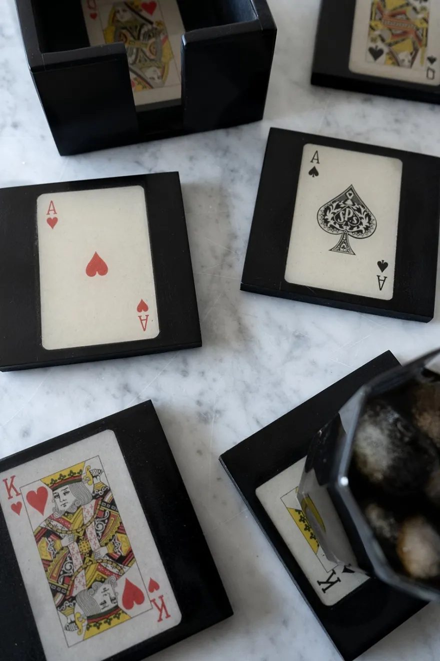 Seis originales posavasos de madera con diseño de distintas cartas, ideales para complementar tu mesa y para colocar las copas y vasos evitando que dejen huella en la mesa.