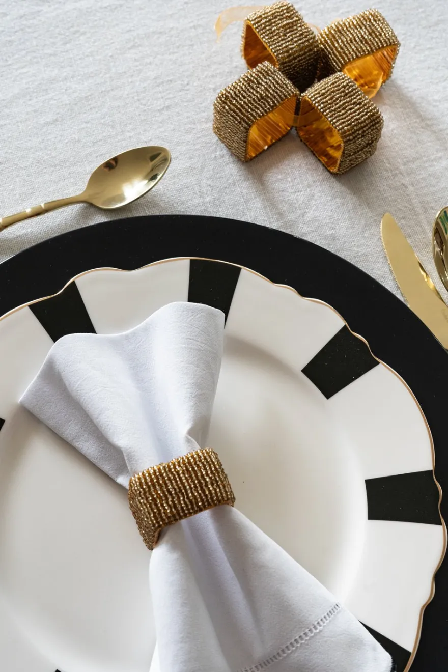 Estos servilleteros destacan por su bordado con cuentas de bolitas con diseño dorado, que le dan un toque de lujo y sofisticación a cualquier mesa. Perfectos para cenas especiales o para elevar la decoración diaria de tu mesa.