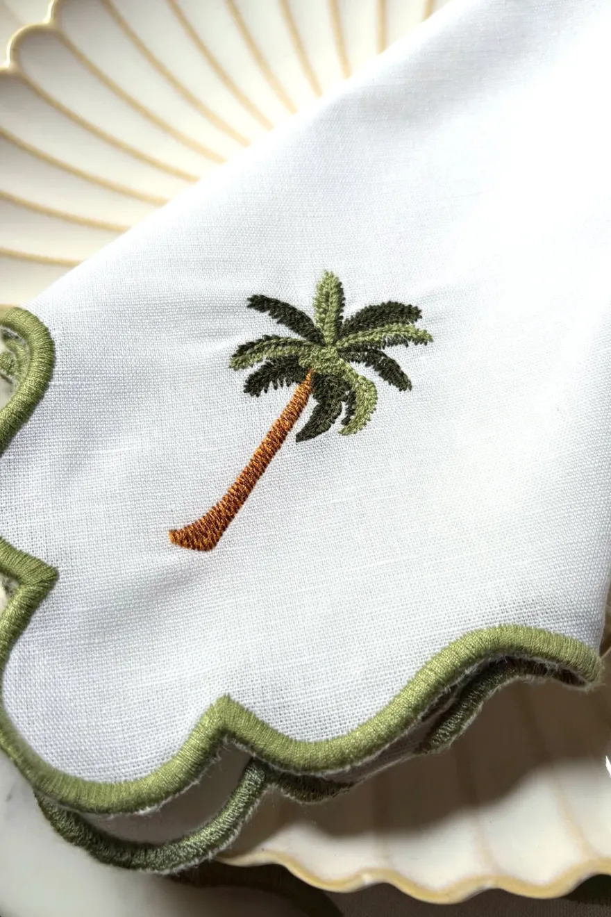 Eleva la presentación de tu mesa con esta servilleta de lino y algodón, una pieza que combina frescura, suavidad y un diseño cuidadosamente elaborado. De color blanco, su contorno ondulado en tono verde añade un toque colorido. En una de sus esquinas, una delicada palmera bordada a mano aporta un guiño tropical sutil y elegante, ideal para mesas veraniegas o decoraciones con inspiración natural.