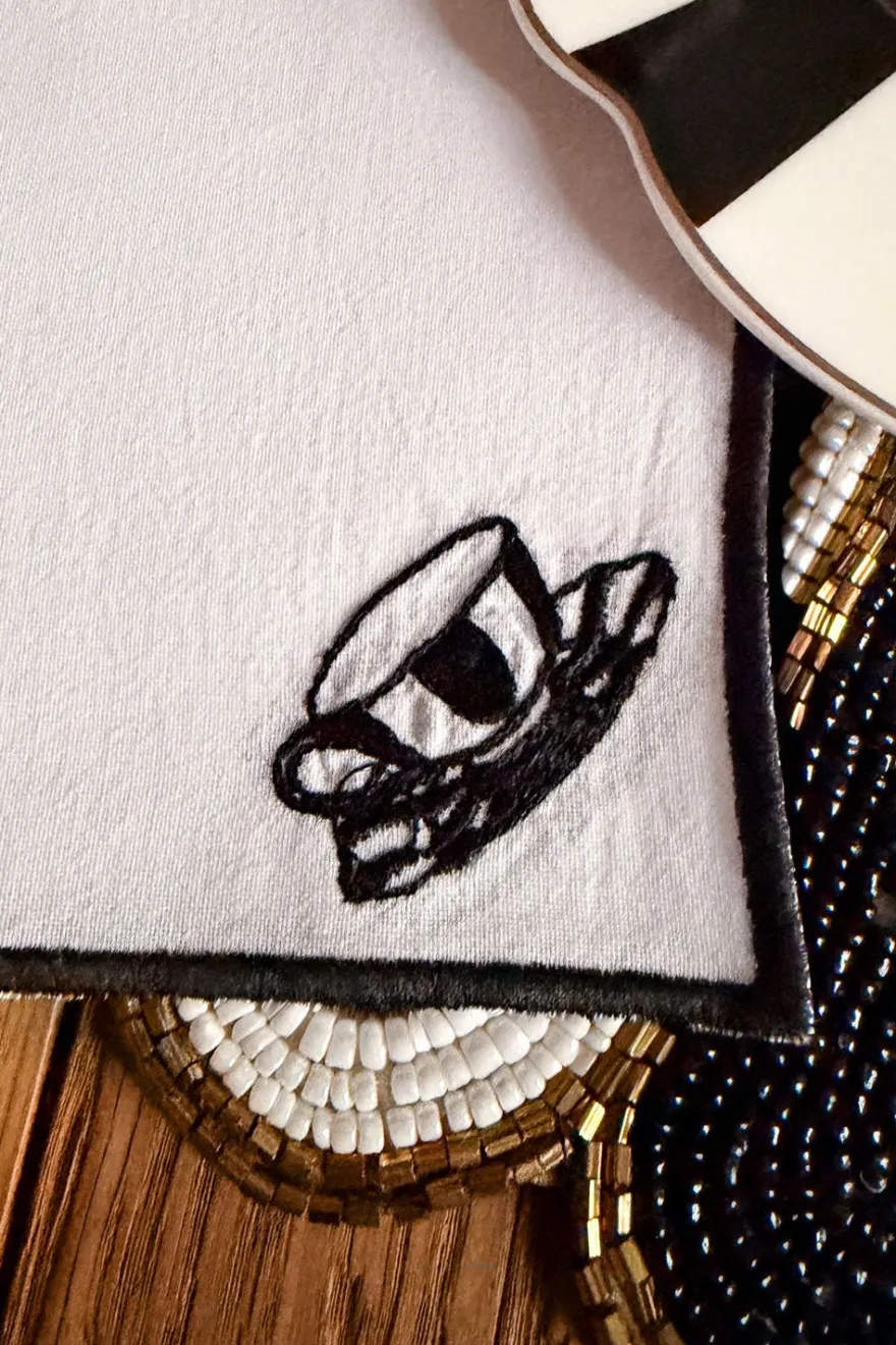 Servilleta de cóctel confeccionada en 100% hilo de algodón blanco, de textura suave y acabado elegante. Su diseño se realza con un borde negro que aporta contraste y un toque contemporáneo. En una de las esquinas destaca la delicada figura bordada de nuestra taza CO, un detalle sutil y encantador que añade personalidad.