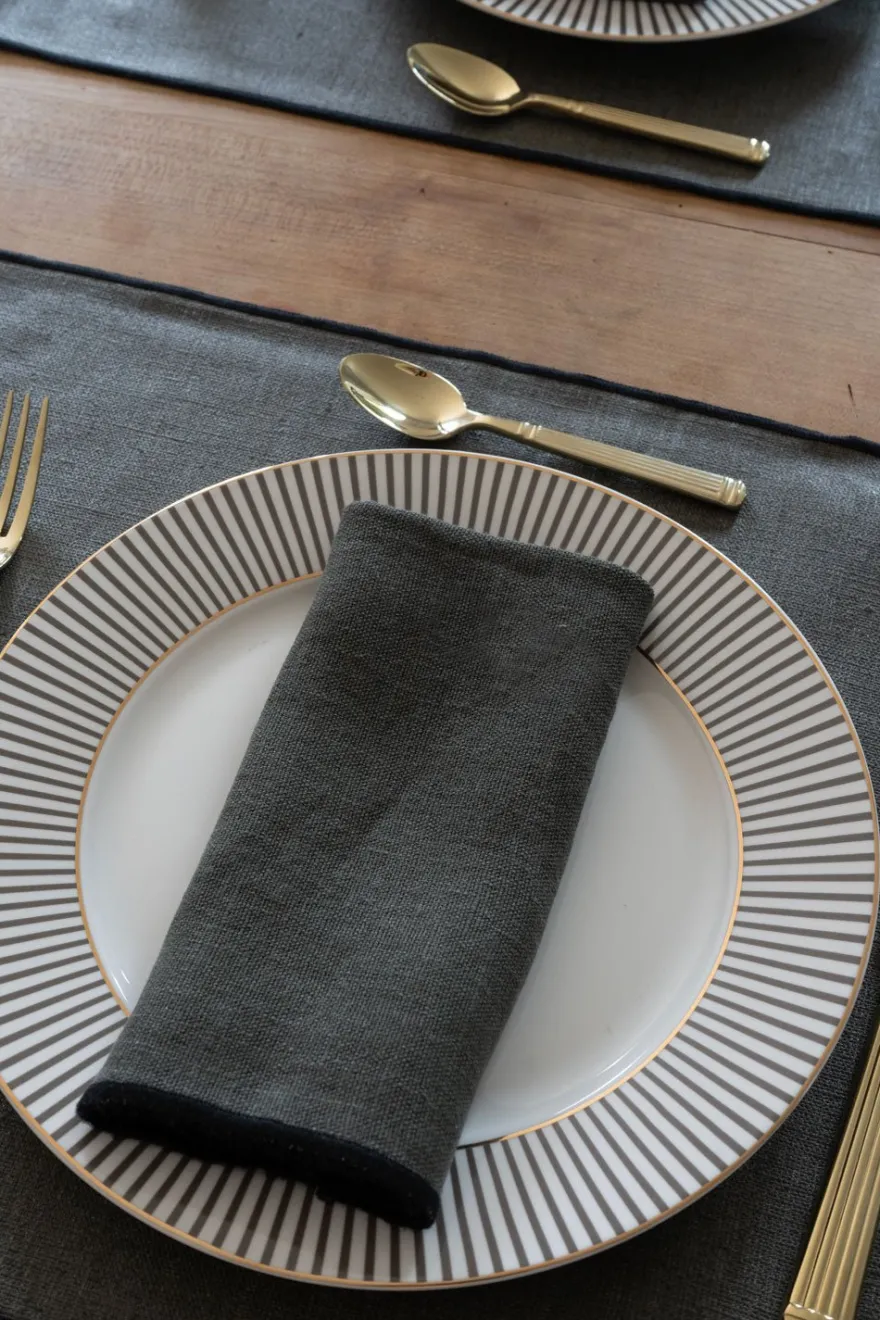 Servilleta de lino hecha a mano, en color caqui con borde en color negro, que le dará un aspecto fresco, elegante y lujoso a tu mesa. Se puede usar a diario o para una gran celebración.