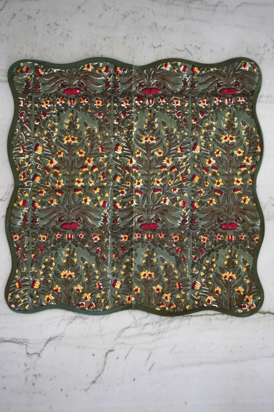 Servilleta de 100% algodón con borde ondulado y diseño de flores verdes pintada a mano en la India. Perfecta para celebraciones, comidas al aire libre o simplemente para alegrar el día a día.