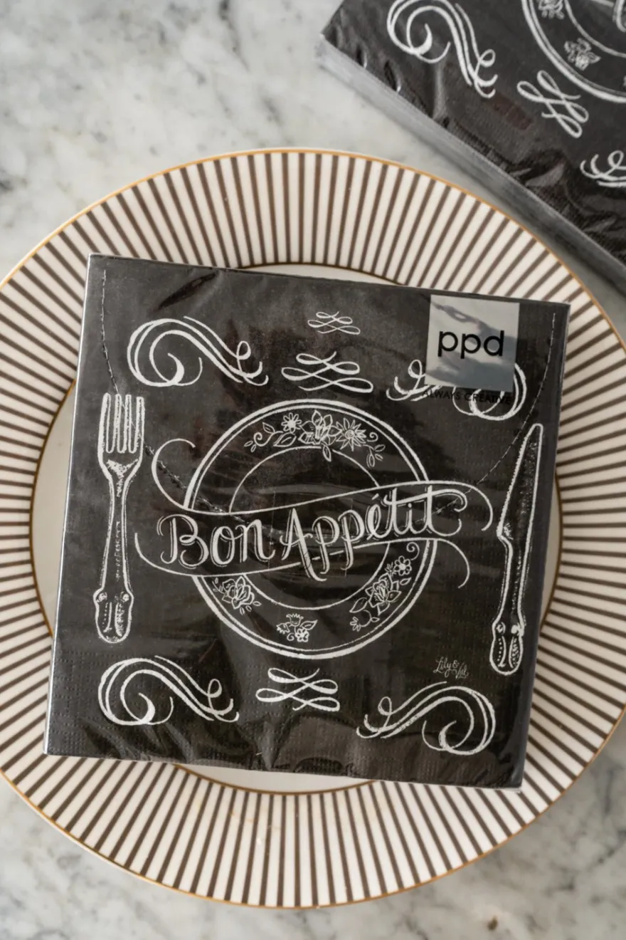 Servilletas de papel negras con diseño «BON APPETIT», ideales y originales para complementar tu mesa.