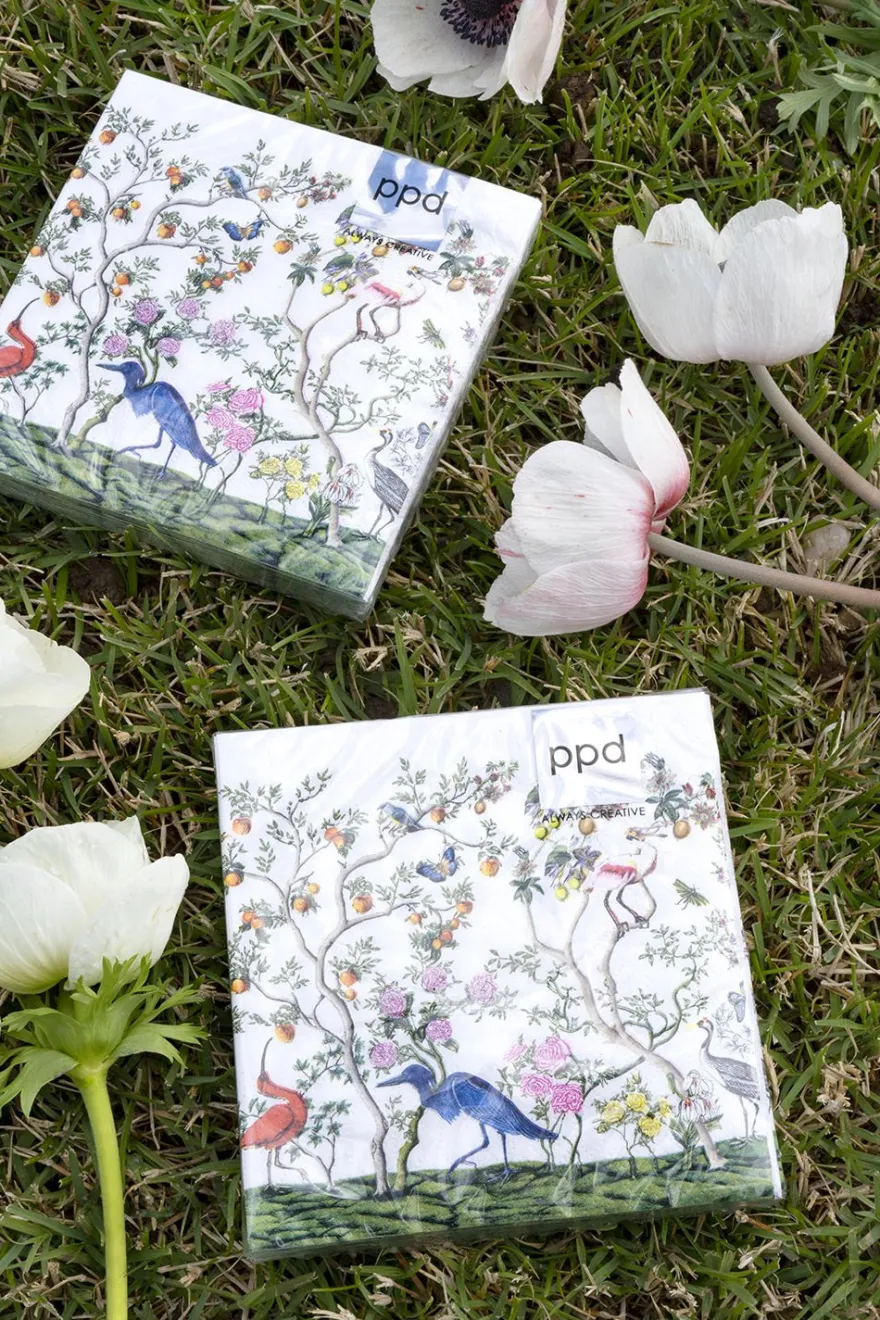 Servilletas de papel con ilustración de plantas y aves chinas, ideales para complementar tu mesa.