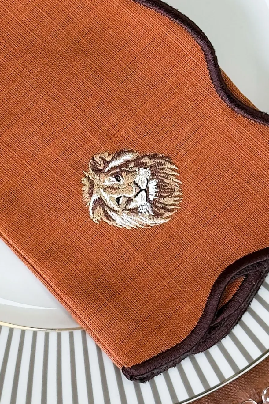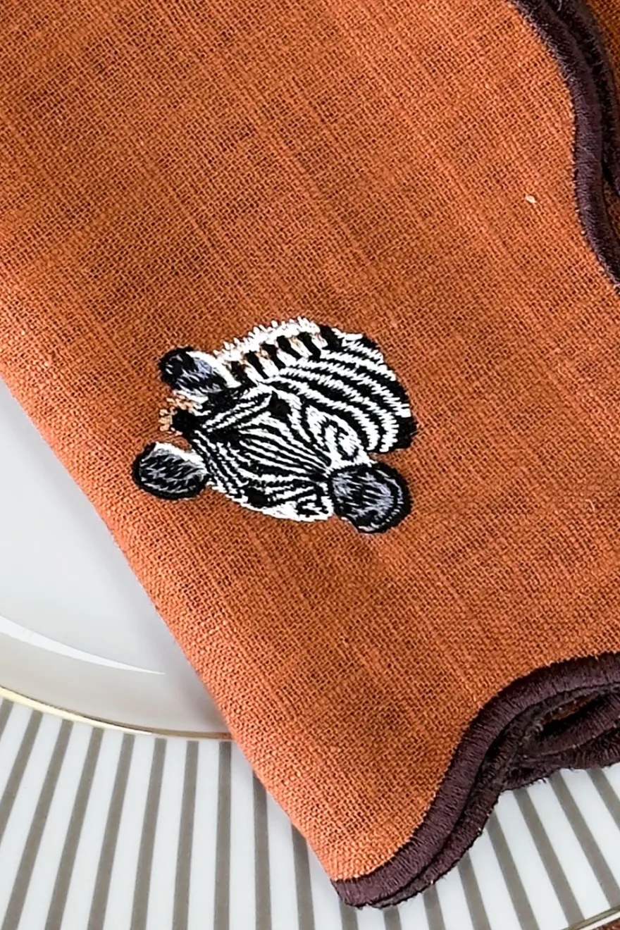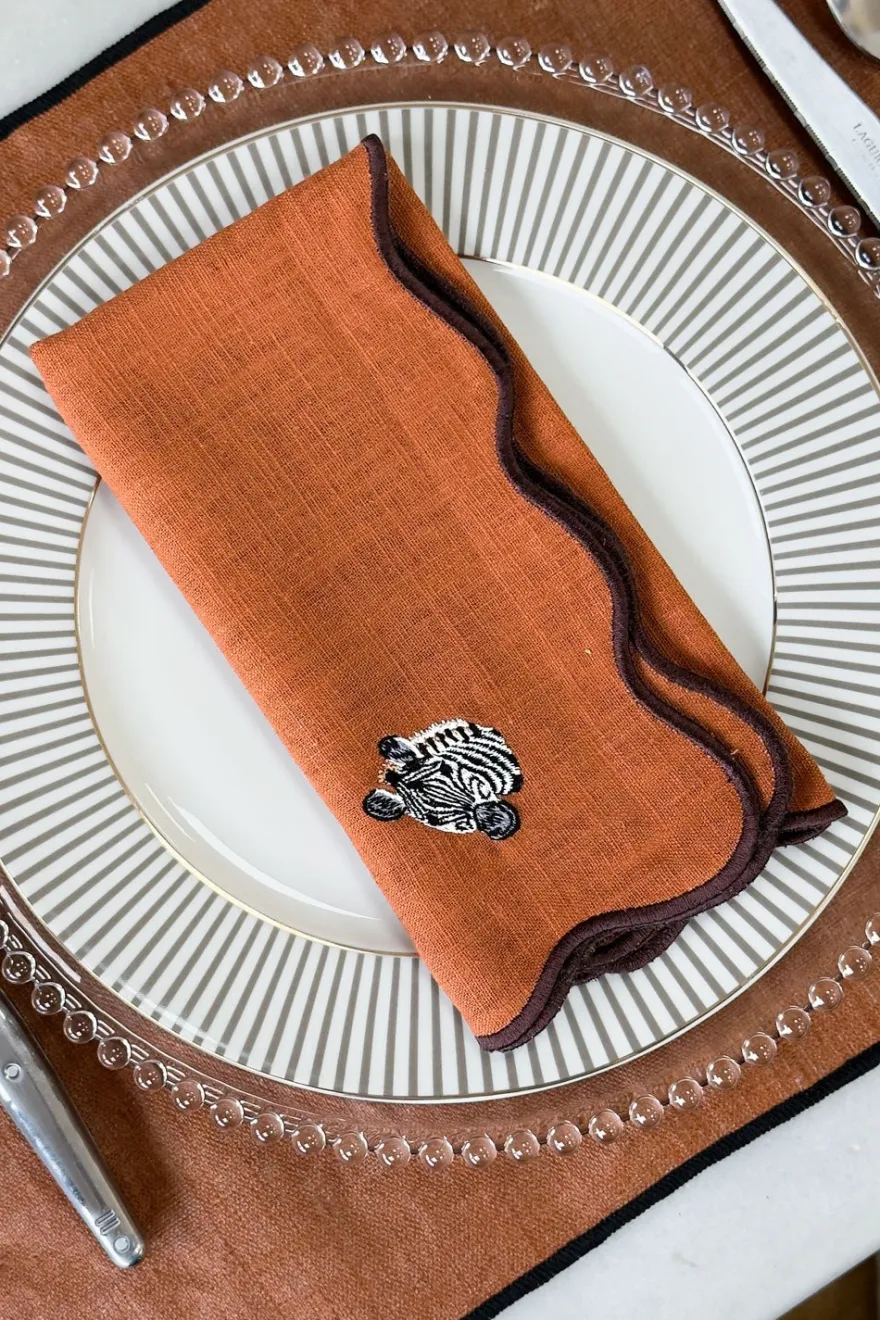 Set de 4 servilletas confeccionadas en algodón y lino en un elegante tono caldera, diseñadas para aportar calidez y personalidad a la mesa. Cada servilleta presenta un delicado borde ondulado y el bordado de un animal de la selva diferente, creando un conjunto original y lleno de encanto.