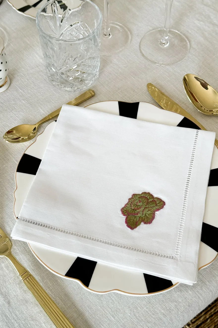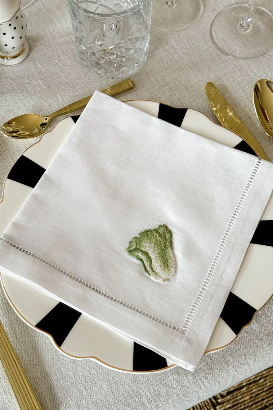Este set de seis servilletas de 100% algodón bordadas a mano es perfecto para añadir un toque de elegancia natural a tu mesa. Cada servilleta presenta una delicada ilustración de una verdura diferente, cuidadosamente bordada a mano con hilos de distintos colores.