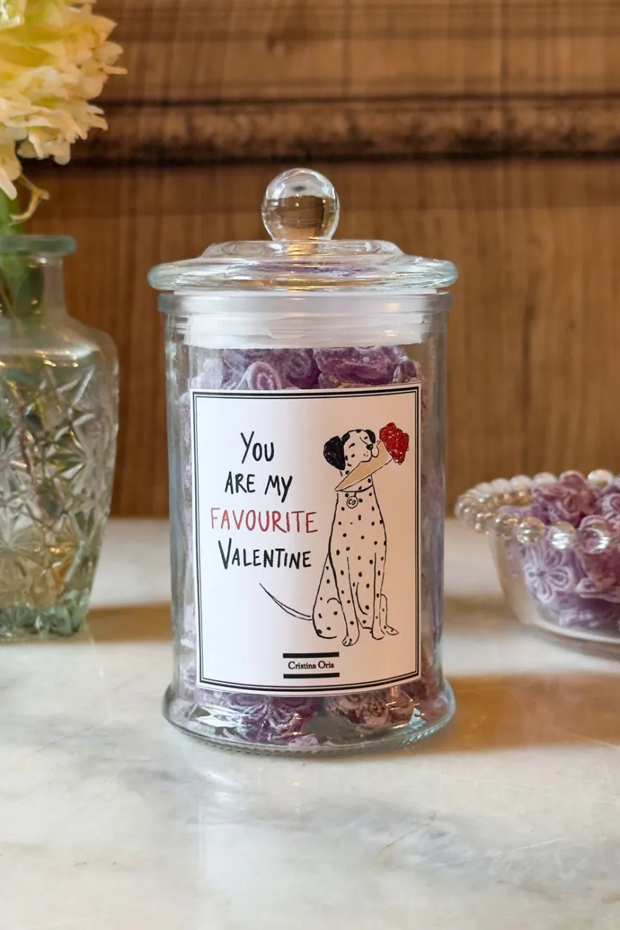 – Deliciosas violetas sin gluten presentadas en un tarro de cristal con dedicatoria especial «You Are My Favourite Valentine»