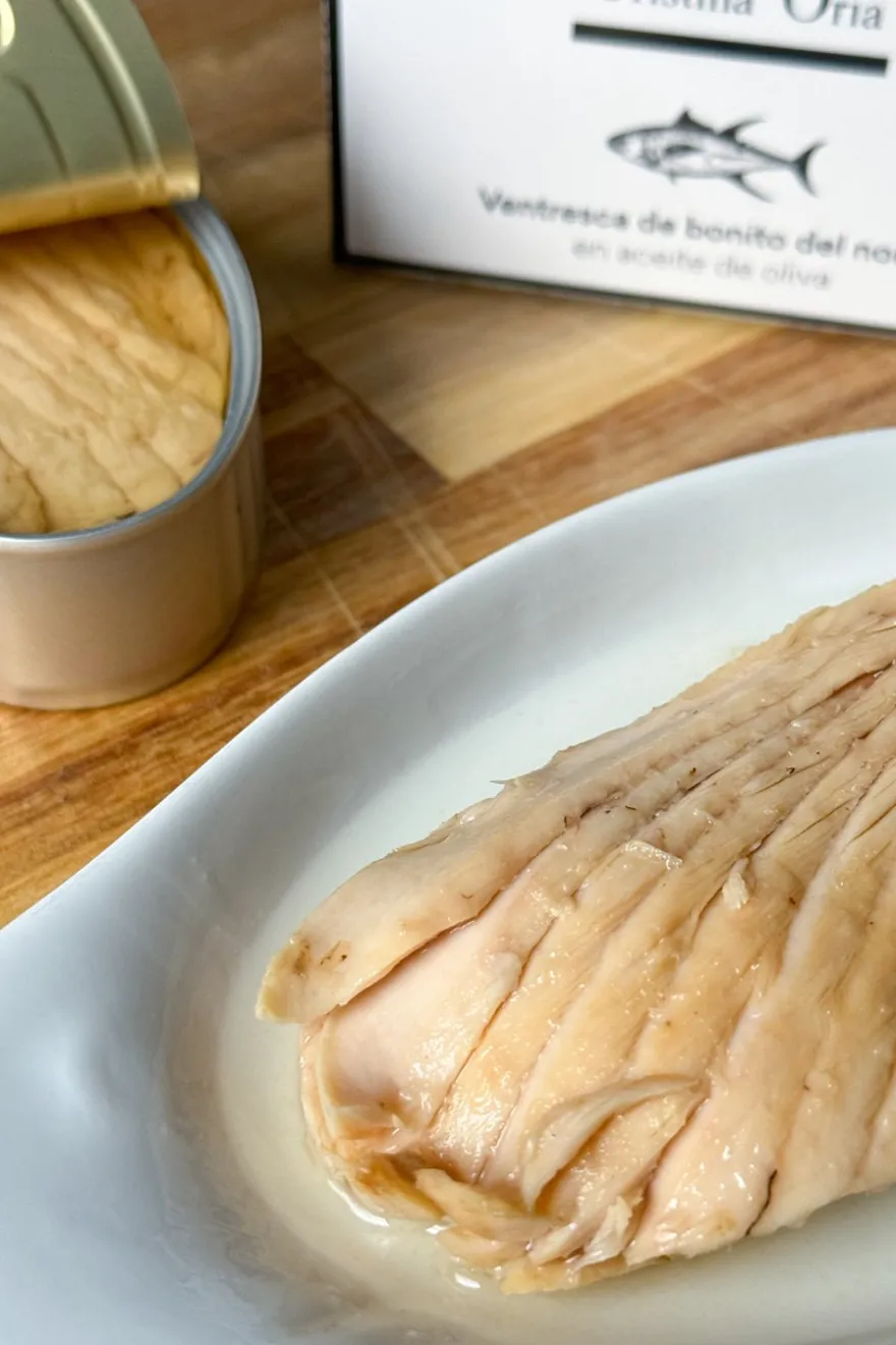 La Ventresca de Bonito del Norte proviene de las frías y cristalinas aguas del Mar Cantábrico. Capturado durante la temporada de verano, este bonito es cuidadosamente seleccionado por su excelente calidad y sabor inigualable, de un bonito del Norte de unos 9 kilos, solo se consigue una única lata. La ventresca, la parte inferior y más apreciada del bonito, se distingue por su textura suave y jugosa, con finas vetas de grasa que le confieren una untuosidad única y un sabor profundo y refinado. Se presenta en aceite de oliva, lo que realza su sabor y conserva toda su frescura y calidad.
