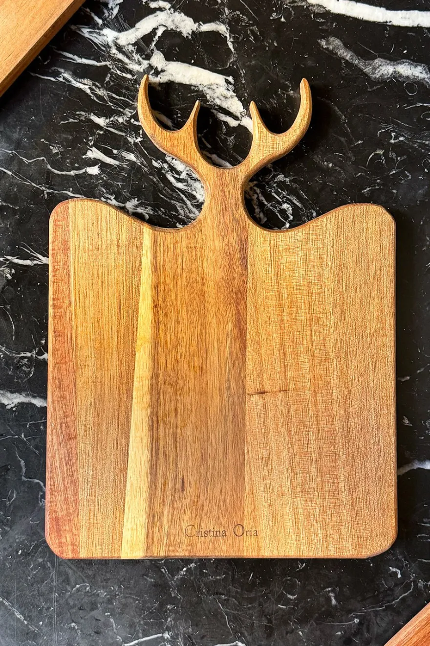 Estas elegantes tablas rectangulares están elaboradas en madera de acacia natural, reconocida por su resistencia y atractiva veta. Su diseño distintivo destaca en la parte superior, donde se talla con detalle la silueta de los cuernos de un ciervo, añadiendo un toque rústico y sofisticado.