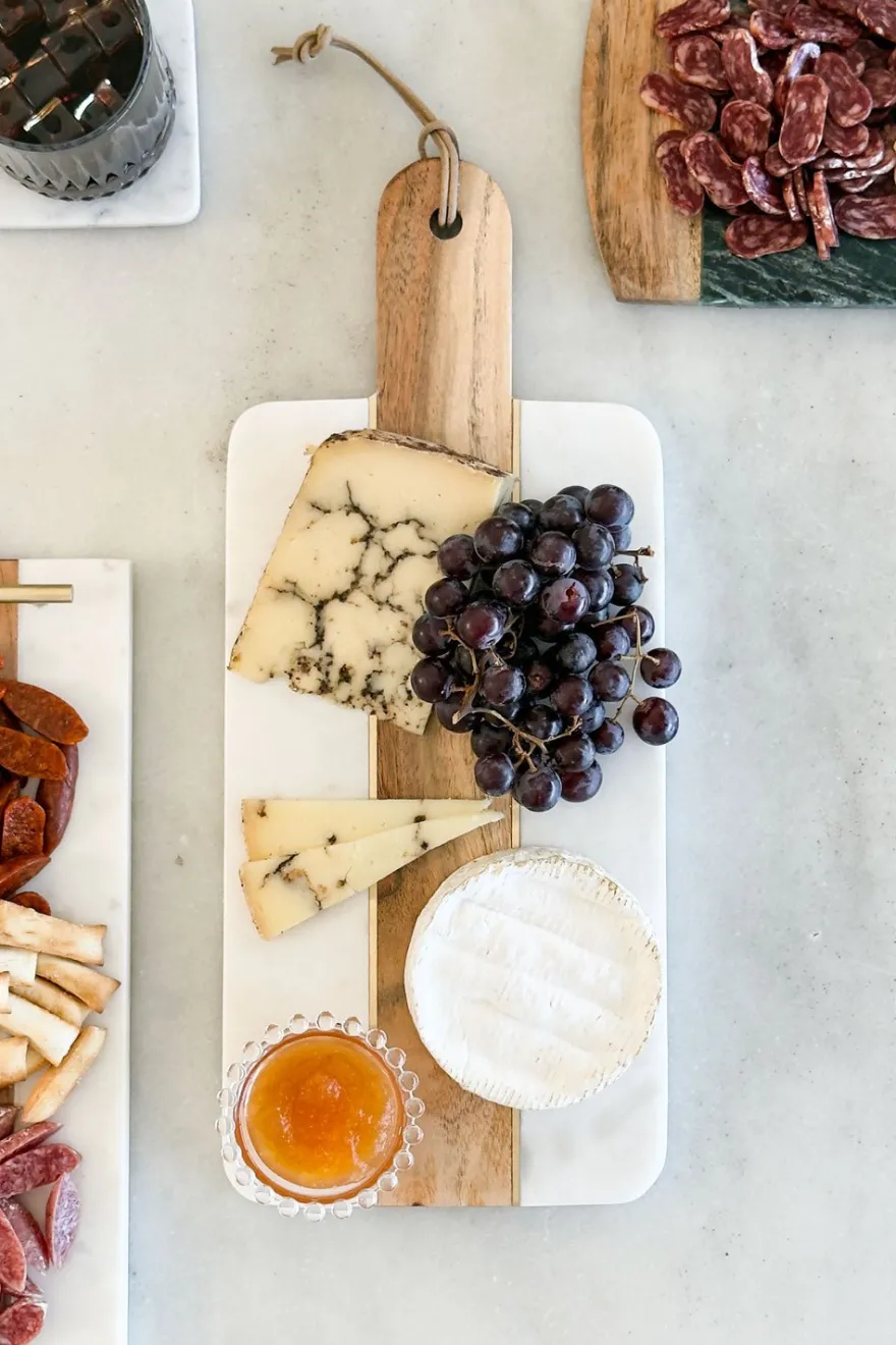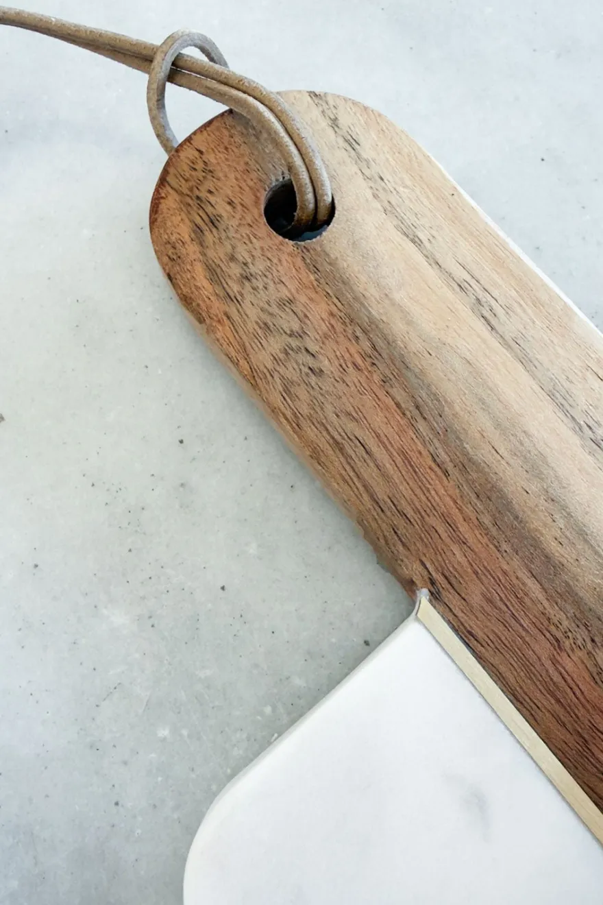 Tabla de servir rectangular con diseño alargado que combina la elegancia del mármol blanco con la calidez de la madera natural. Incorpora un práctico mango de madera que facilita su manejo y aporta un estilo artesanal, complementado con sutiles detalles en latón dorado que elevan su acabado.