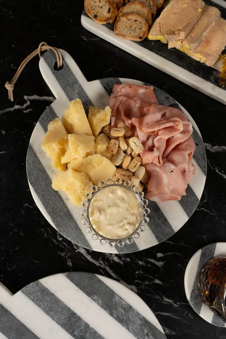 Tabla redonda de mármol con diseño de rayas blancas y grises oscuras, ideal para complementar tus mesas en cualquier época del año.