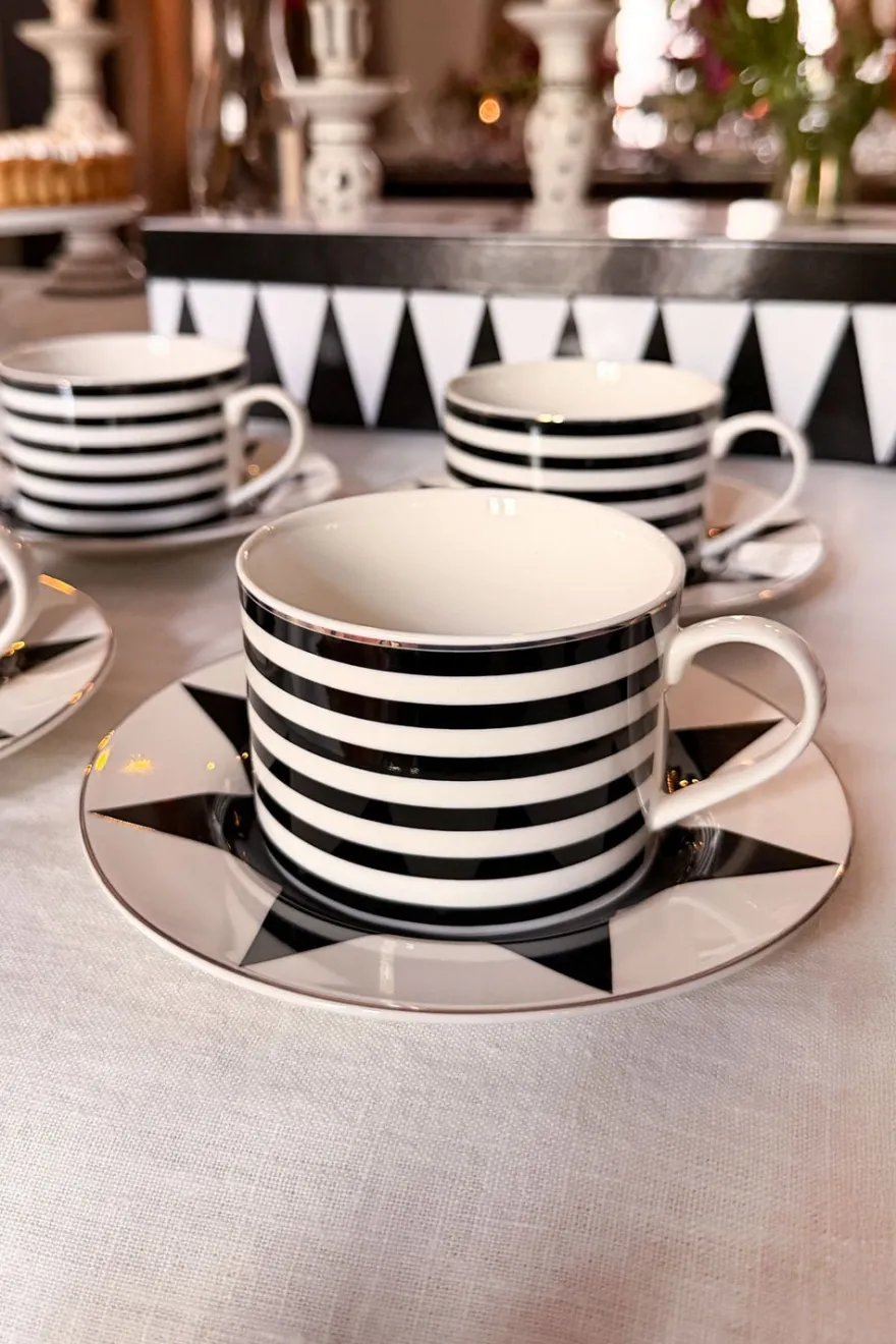 Set de cuatro tazas y platos con diseño «circus» de New Bone China, reconocida por ser muy fina, ligera y resistente, de nuestra vajilla blanca y negra.