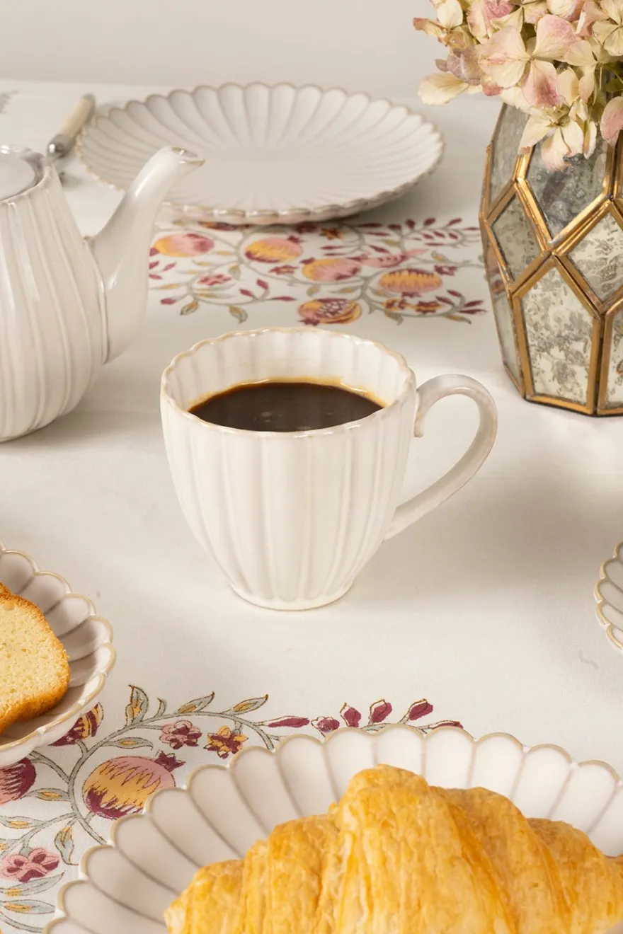 Mug de nuestra Vajilla Blanca Flor CO de Stoneware, muy resistente y gracias a su diseño único con ondas en color blanco y remates en tonos crudos, es versátil para disfrutarla en cualquier época del año.