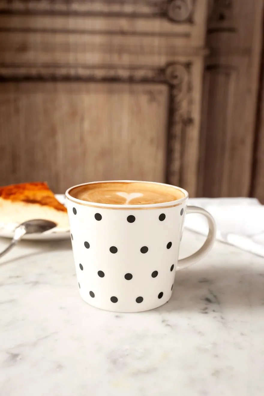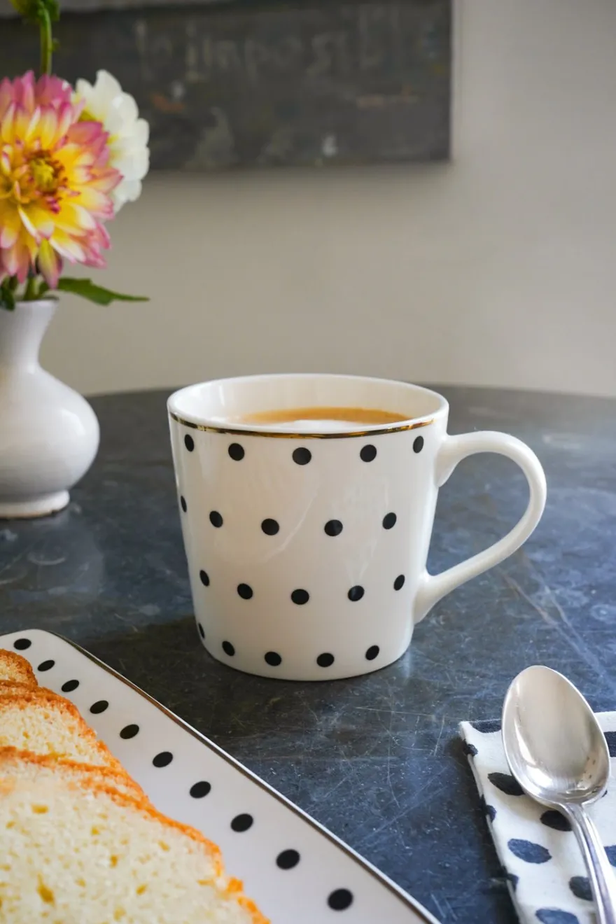 Taza negra y blanca con diseño de puntos y delicado filo dorado decorando, perfecta para disfrutar del café, té e infusiones, añadiendo un toque de elegancia a cualquier momento del día.