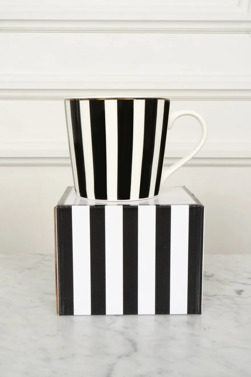 Taza negra y blanca con diseño de rayas y delicado filo dorado decorando, perfecta para disfrutar del café, té e infusiones, añadiendo un toque de elegancia a cualquier momento del día.