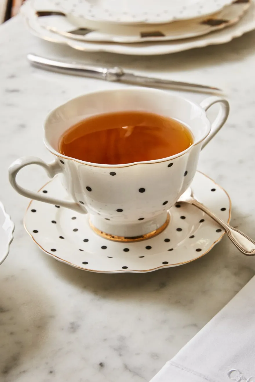Con nuestro diseño propio de lunares negros en fondo blanco, con borde en color dorado, de nuestra Colección Cristina Oria.
