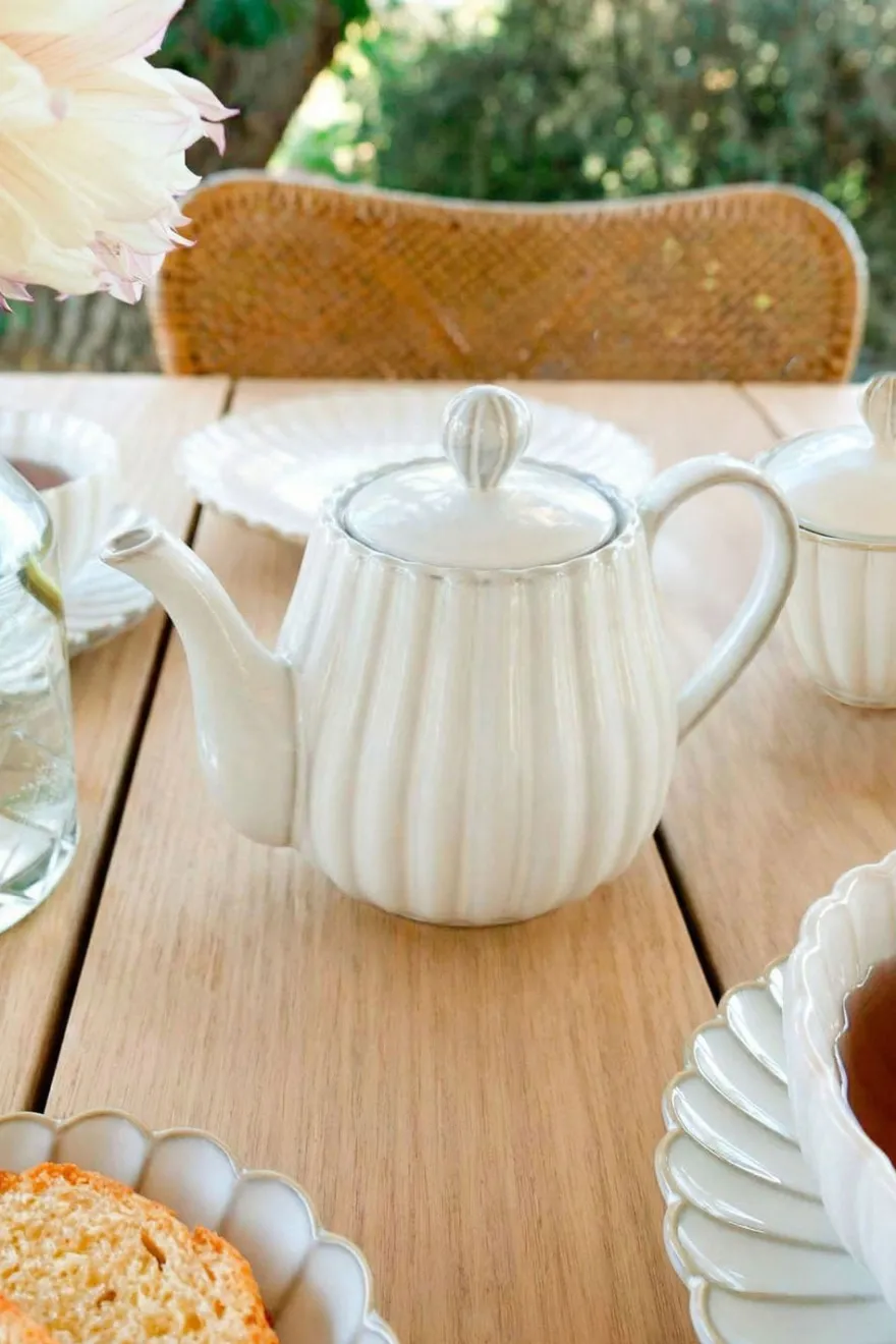Tetera de nuestra Vajilla Blanca Flor CO de Stoneware, muy resistente y gracias a su diseño único con ondas en color blanco y remates en tonos crudos, es versátil para disfrutarla en cualquier época del año.