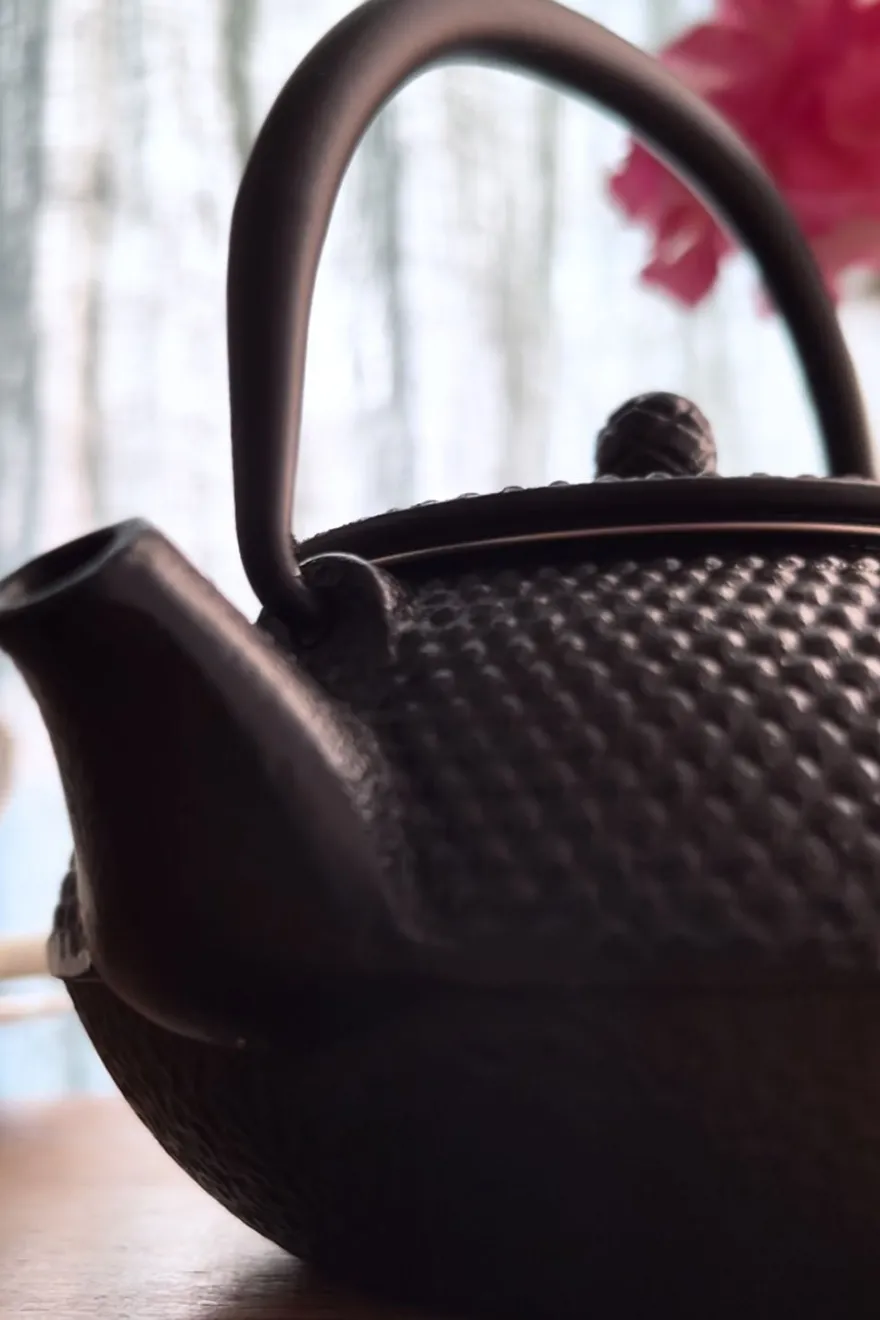 Tetera de hierro fundido con asa y tapa en color negro con filtro incluido. Su interior esmaltado permite conservar mejor el calor.
